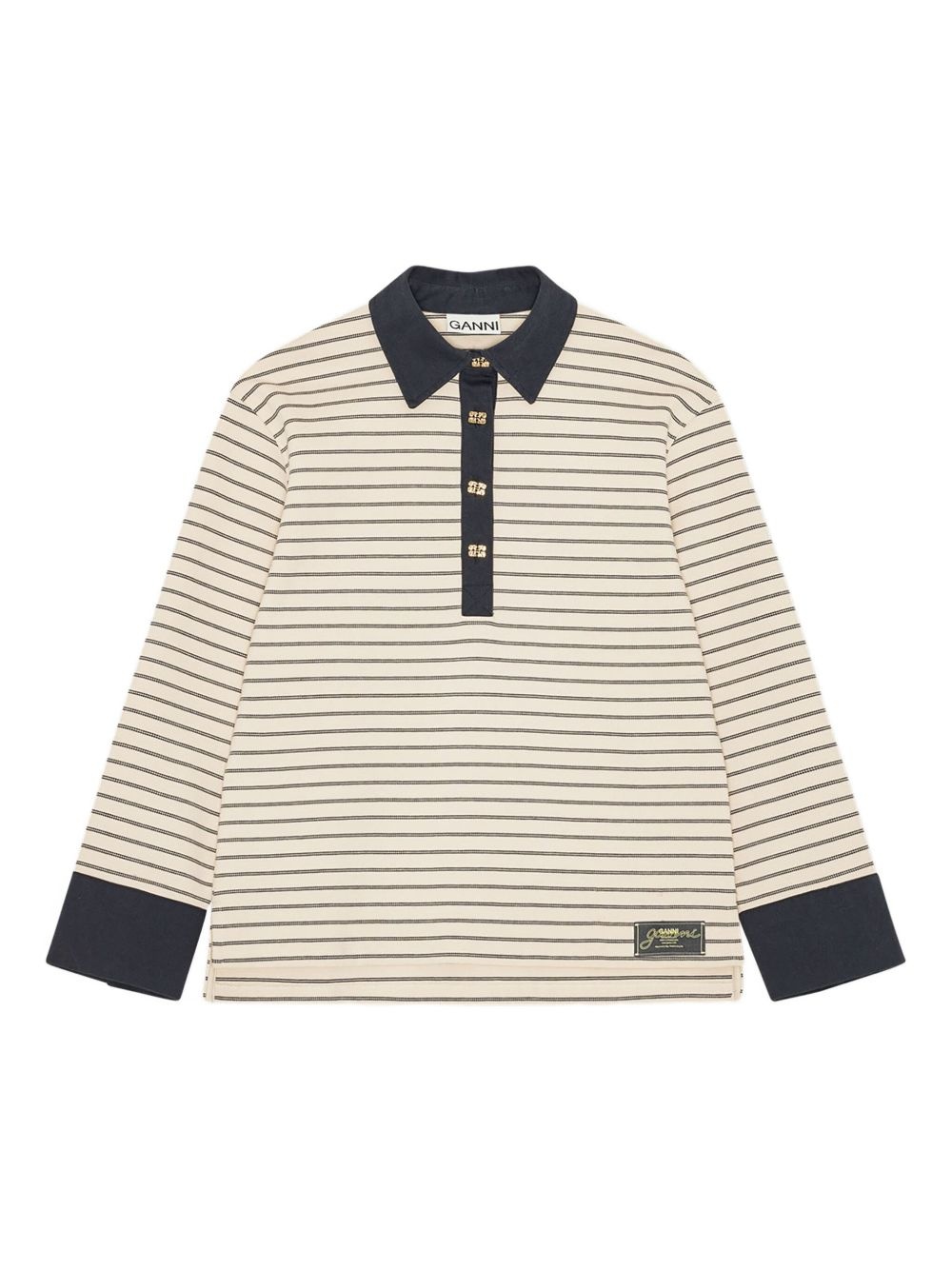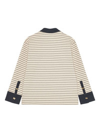 striped long-sleeve polo shirt Highlights - Cream and navy - Horizontal stripe pattern - Contrast collar - Button placket - Contrasting cuffs - Logo plaque detail Imported Composition Fabric 100% Washing instructions Read Manufacturer Guidelines