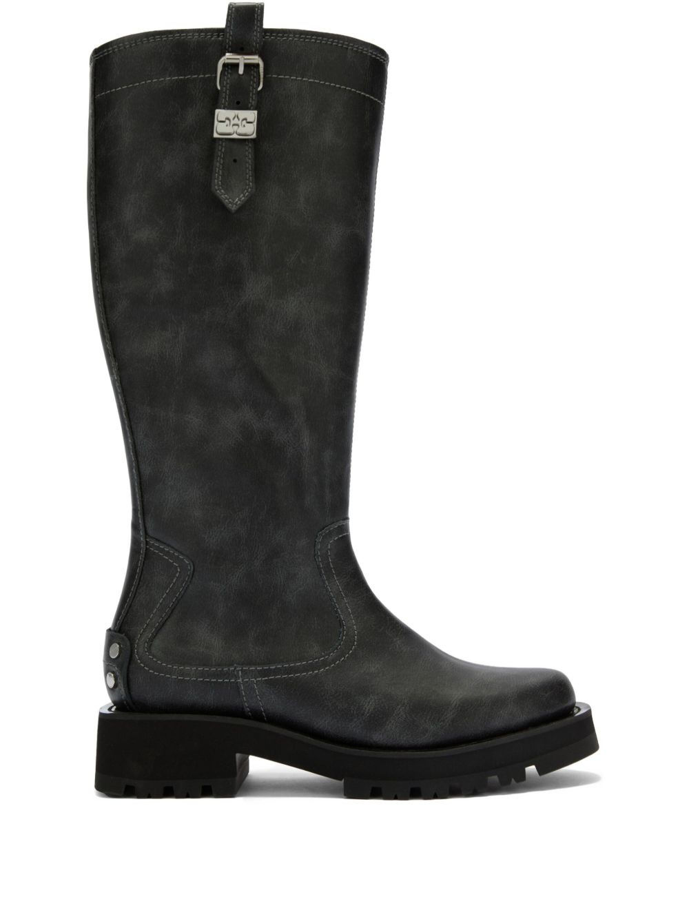 studs knee-high boots Highlights - Ebony - Buckle detail - Block heel - Pull-on style - Round toe - Lug sole Imported Composition Outer: Recycled Leather 60%, TENCEL™ Lyocell (LENZING) 26%, Polyurethane 14% Lining: Leather 100% Sole: Rubber 100%