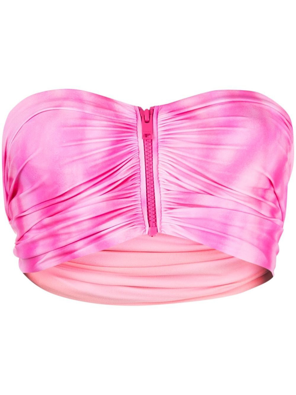 tie-dye bandeau bikini top tie-dye bandeau bikini top from GANNI featuring pink, recycled polyamide blend, bandeau style, tie-dye pattern, front zip fastening and ruched bodice. Conscious: This item is made from at least 50% recycled or upcycled materials. For recycled synthetic clothing products we highly recommend using a microfibre-catching washing bag to ensure that no microplastics that can pollute water are released in the process.. Imported Composition Outer: Recycled Polyamide 78%, Elastane 22% Lining: Recycled Polyamide 83%, Elastane 17% Washing instructions Machine Wash