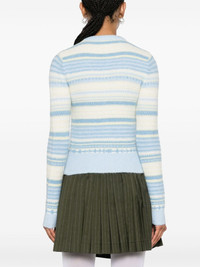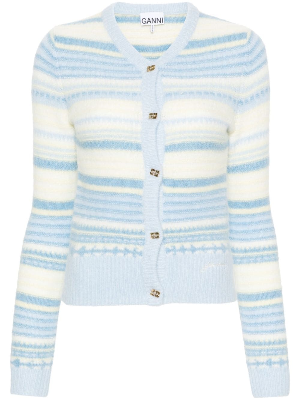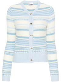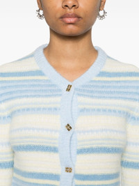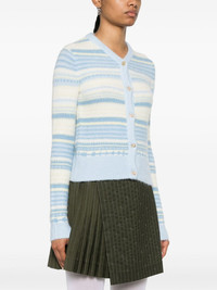 V-neck striped cardigan Highlights - Blue/multicolour - Knitted construction - Horizontal stripe pattern - Embroidered logo to the front - Ribbed trim - Gold-tone buttons - V-neck - Long sleeves - Straight hem - Front button fastening Made in Italy Composition Merino 32%, Alpaca Wool 32%, Polyamide 30%, Elastane 6% SIZE & FIT Model measurements Height 5 ft 10 in(1.78 m) Bust/Chest 32.67 in(83 cm) Hips 35.43 in(90 cm) Waist 23.22 in(59 cm) Measurement SLEEVE LENGTH 25.19 in(64 cm) LENGTH 20.07 in(51 cm) BUST 28.34 in(72 cm) Shoulder Width 12.59 in(32 cm) FittingInformation Designed for a slim fit that sits just away from the body offering a close yet comfortable fit Made with a midweight knit, this piece offers some stretch This piece fits true to size – take your usual size