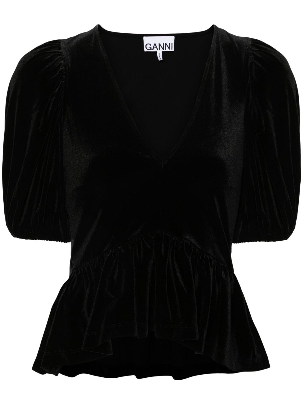 V-neck velvet blouse Highlights - Black - Recycled polyester - Velvet - V-neck - Short puff sleeves - Peplum waist - High-low hem Imported Composition Recycled Polyester 94%, Elastane 6% SIZE & FIT Model measurements Height 5 ft 11 in(1.8 m) Bust/Chest 33.07 in(84 cm) Hips 37 in(94 cm) Waist 25.59 in(65 cm) Measurement SLEEVE LENGTH 11.81 in(30 cm) LENGTH 21.25 in(54 cm) WAIST 25.19 in(64 cm) FittingInformation Designed for a slim fit that sits just away from the body offering a close yet comfortable fit The elasticated waist allows for a comfortable fit Made from a midweight stretch fabric, this piece offers elasticity and flexibility when worn This piece fits true to size – take your usual size Washing instructions Machine Wash