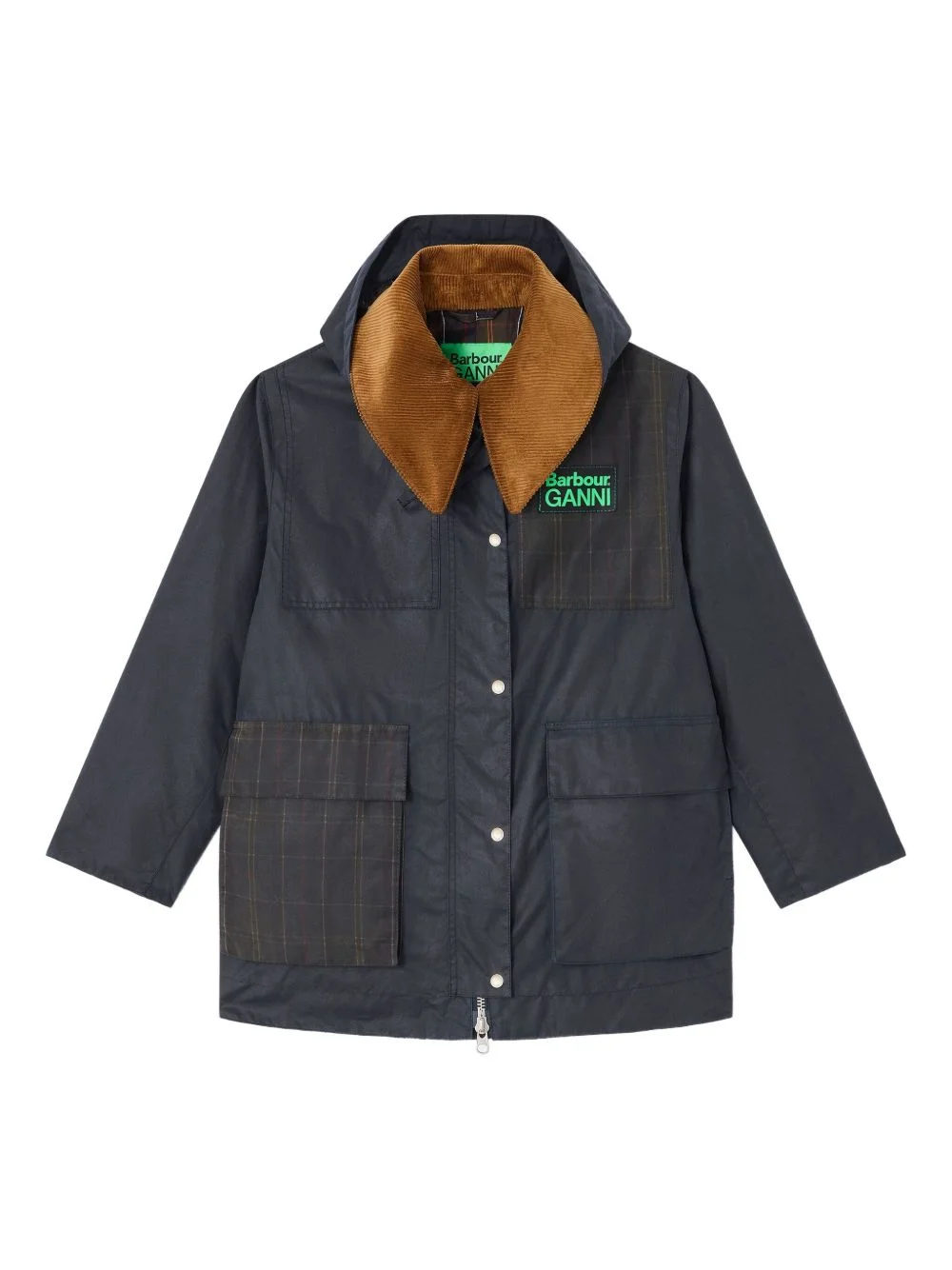 x Barbour corduroy-collar coat Highlights - Dark blue - Corduroy collar - Check-pattern panels - Front pockets - Press-stud and zip fastening - Hooded Imported Composition Fabric 100% Washing instructions Read Manufacturer Guidelines