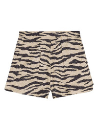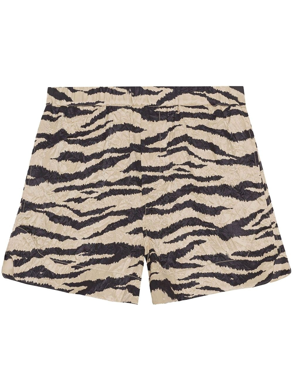 zebra-print crinked shorts The vibrant zebra print of these shorts speaks to GANNI's playful aesthetic. The crinkled finish add to the piece's lively look. Highlights - Beige - Black - Recycled polyester blend - Zebra print - Crinkled finish - High waist - Flared - Thigh-length Imported Composition Recycled Polyester 95%, Elastane 5%