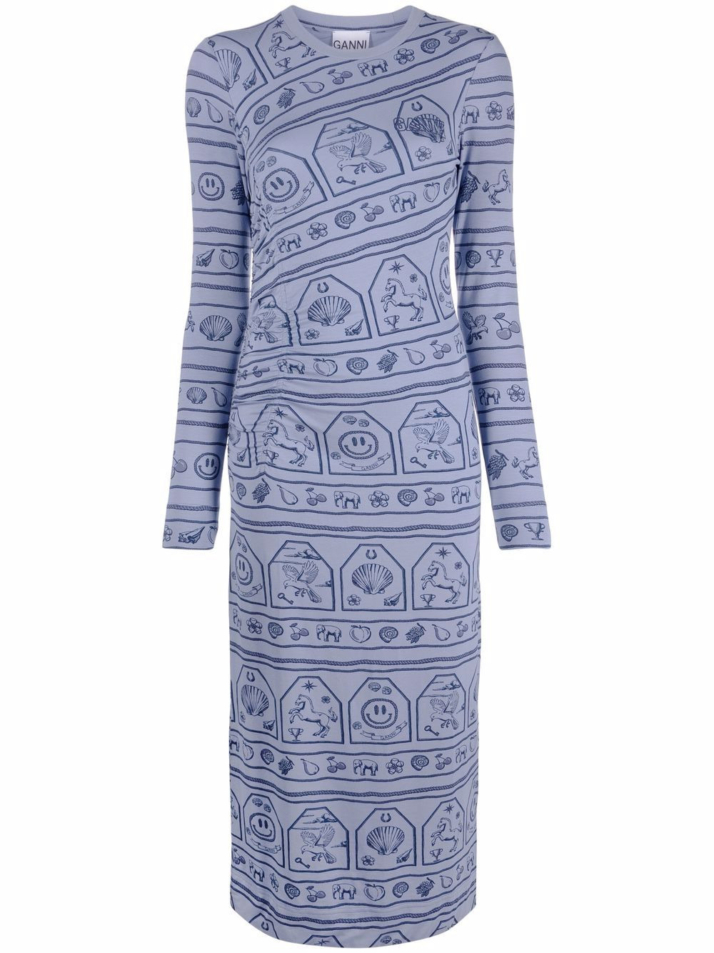 zodiac logo-print stretch-jersey dress Known for their playful prints, GANNI presents this fitted stretch-jersey dress for SS22. Presented in a heather blue hue, it features a gathered detail to the side and all-over zodiac-style print. Highlights - Heather blue - All-over logo print - Gathered detailing - Round neck - Long sleeves - Stretch-design - Tonal stitching - Long length - Straight hem Imported Composition Lyocell 96%, Elastane 4% SIZE & FIT Model measurements Height 5 ft 10 in(1.78 m) Bust/Chest 32.28 in(82 cm) Hips 35.03 in(89 cm) Waist 23.22 in(59 cm) FittingInformation This piece fits true to size. We recommend you get your regular size Cut for a slim fit Made with a mid-weight fabric Washing instructions Machine Wash