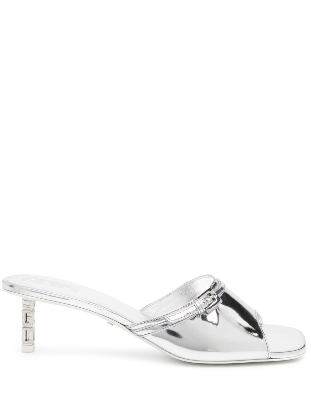 60mm mirrored leather sandals Crafted in Italy from silver-tone laminated leather, these mules depict GCDS' futuristic vision. They're set atop a GCDS Cube chain heel that enhances the modern feel. Highlights - Silver-tone - Calf leather - Mirrored finish - Square open toe - Buckle-strap fastening - Slip-on style - Branded footbed - 60mm logo-engraved heel - Leather outsole - This piece comes complete with a protective dust bag. Made in Italy Composition Other fibres 100% SIZE & FIT Measurement HEEL 2.36 in(6 cm)