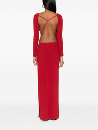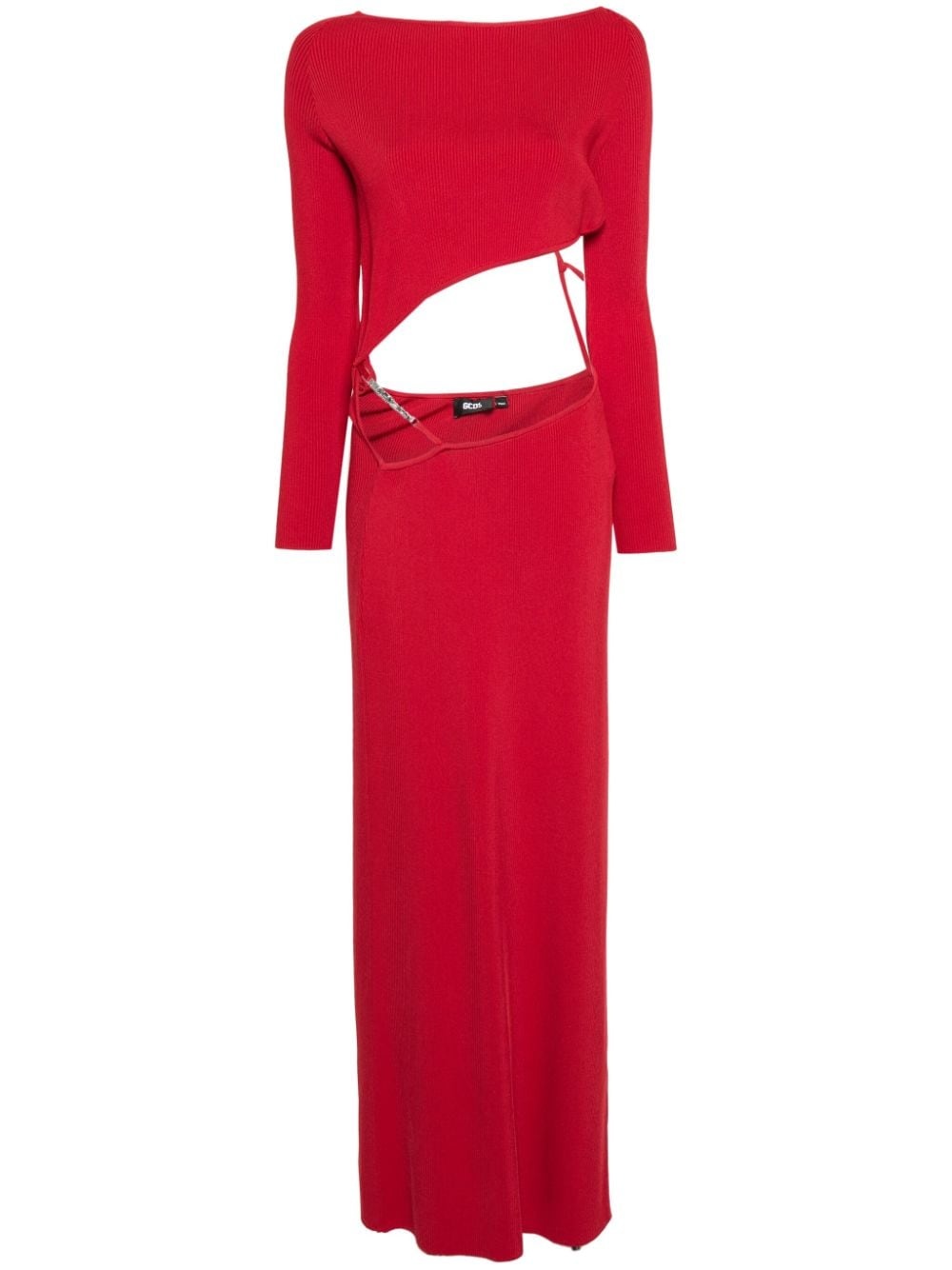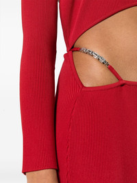 asymmetric ribbed maxi dress Highlights - Bordeaux red - Ribbed knit - Asymmetric design - Cut-out detailing to the waist - Logo cube-chain detailing to the waist - Boat neck - Open back - Long sleeves - Ribbed waistband - Side slit - Ankle-length - Straight hem - Unlined Imported Composition Viscose 94%, Polyester 6% SIZE & FIT Model measurements Height 5 ft 11 in(1.8 m) Bust/Chest 30.7 in(78 cm) Hips 35.03 in(89 cm) Waist 24.4 in(62 cm) FittingInformation Designed for a close fit throughout Made with a midweight knit, this piece offers some stretch This piece fits true to size – take your usual size Washing instructions Hand Wash