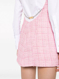 backless tweed minidress Highlights - Light pink - Tweed - Check pattern - Sequin detailing - Backless - Round neck - Sleeveless - Thigh-length - Straight hem Made in Italy Composition Outer: Cotton 44%, Polyester 30%, Acrylic 16%, Polyamide 10% Lining: Viscose 100% SIZE & FIT Model measurements Height 5 ft 10 in(1.78 m) Bust/Chest 31.49 in(80 cm) Hips 36.22 in(92 cm) Waist 25.59 in(65 cm) FittingInformation Designed for a slim fit that sits just away from the body offering a close yet comfortable fit Slightly short in length; consider your own measurements Made from a midweight non-stretch fabric This piece fits true to size – take your usual size Washing instructions Dry Clean Only