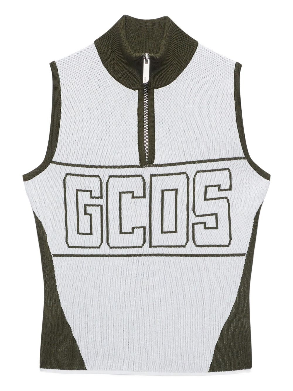 band-logo half-zip top Highlights - White - Short front zip fastening - Colour-block design - High neck - Sleeveless Made in Italy Composition Viscose 65%, Polyamide 35%