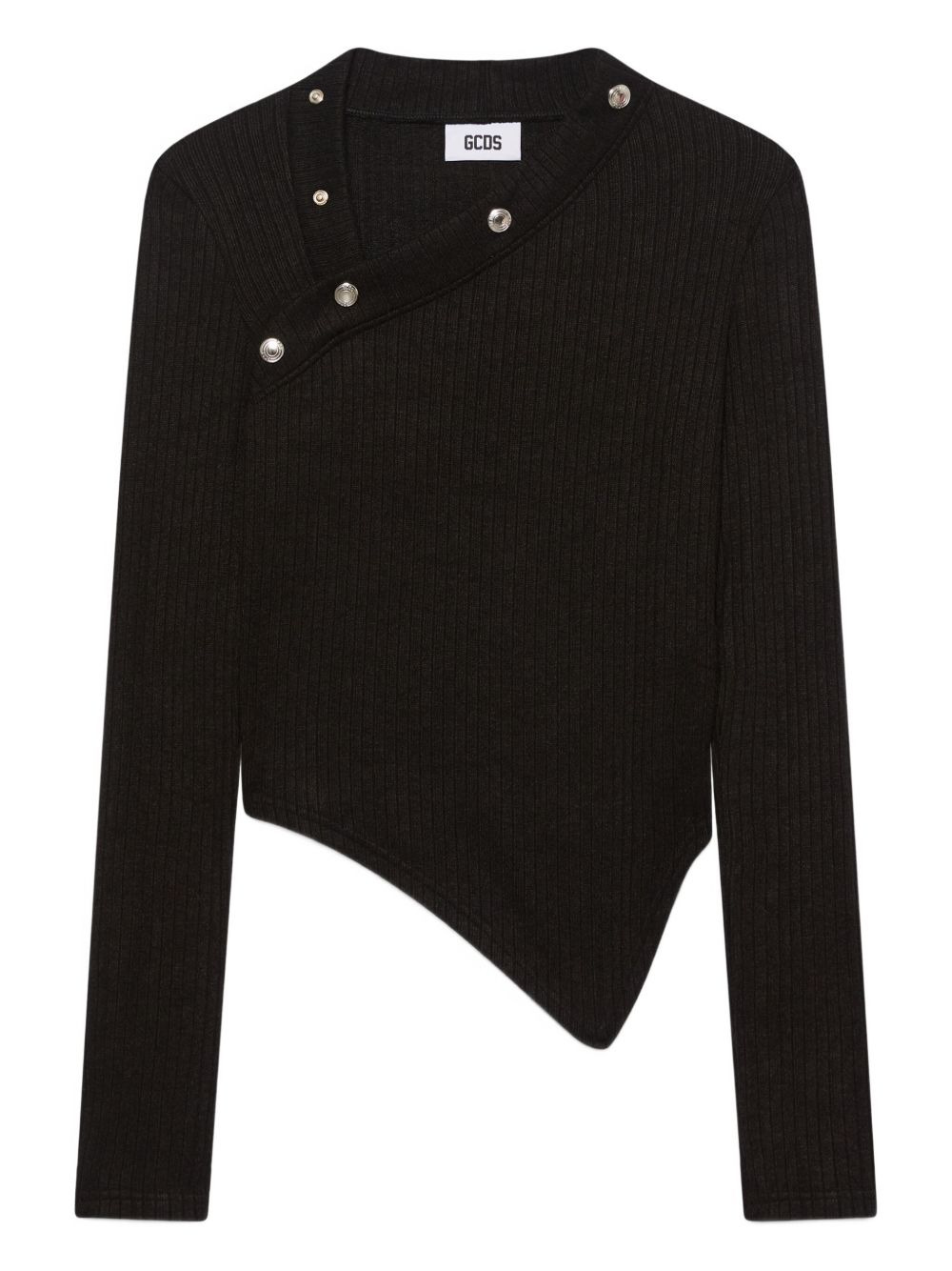 buttoned asymmetric top Highlights - Black - Ribbed knit - Asymmetric hem - V-neck - Button embellishment - Long sleeves Imported Composition Viscose 49%, Polyester 25%, Polyamide 21%, Elastane 5% Washing instructions Read Manufacturer Guidelines