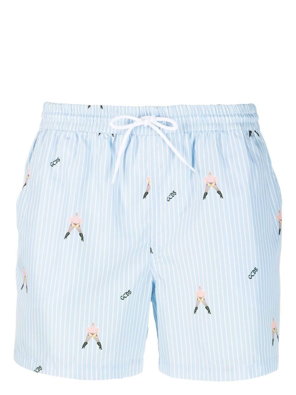 cartoon-print pinstripe shorts Highlights - Baby blue - Pinstripe pattern - Cartoon print - All-over logo print - Rear flap pocket - Two front pouch pockets - Drawstring fastening waist - Straight hem - Be mindful to try on swimwear over your own garments. Made in Italy Composition Polyester 100% Washing instructions Hand Wash