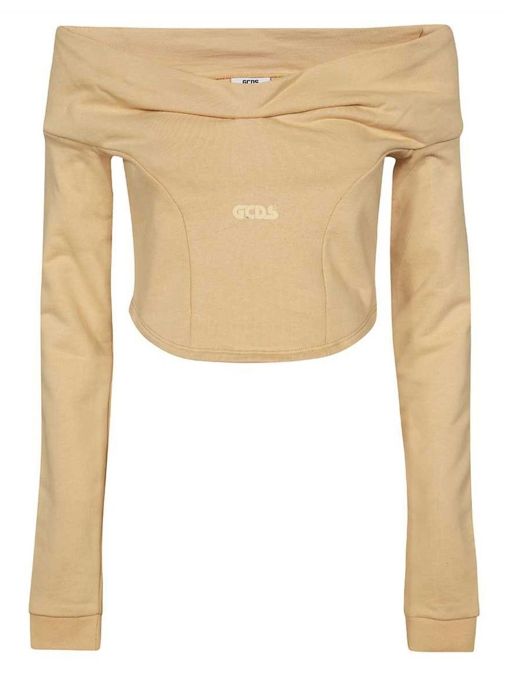 cotton top Highlights - Beige - Boat neck - Long sleeves - Logo print to the front - Cropped Imported Composition Cotton 100%