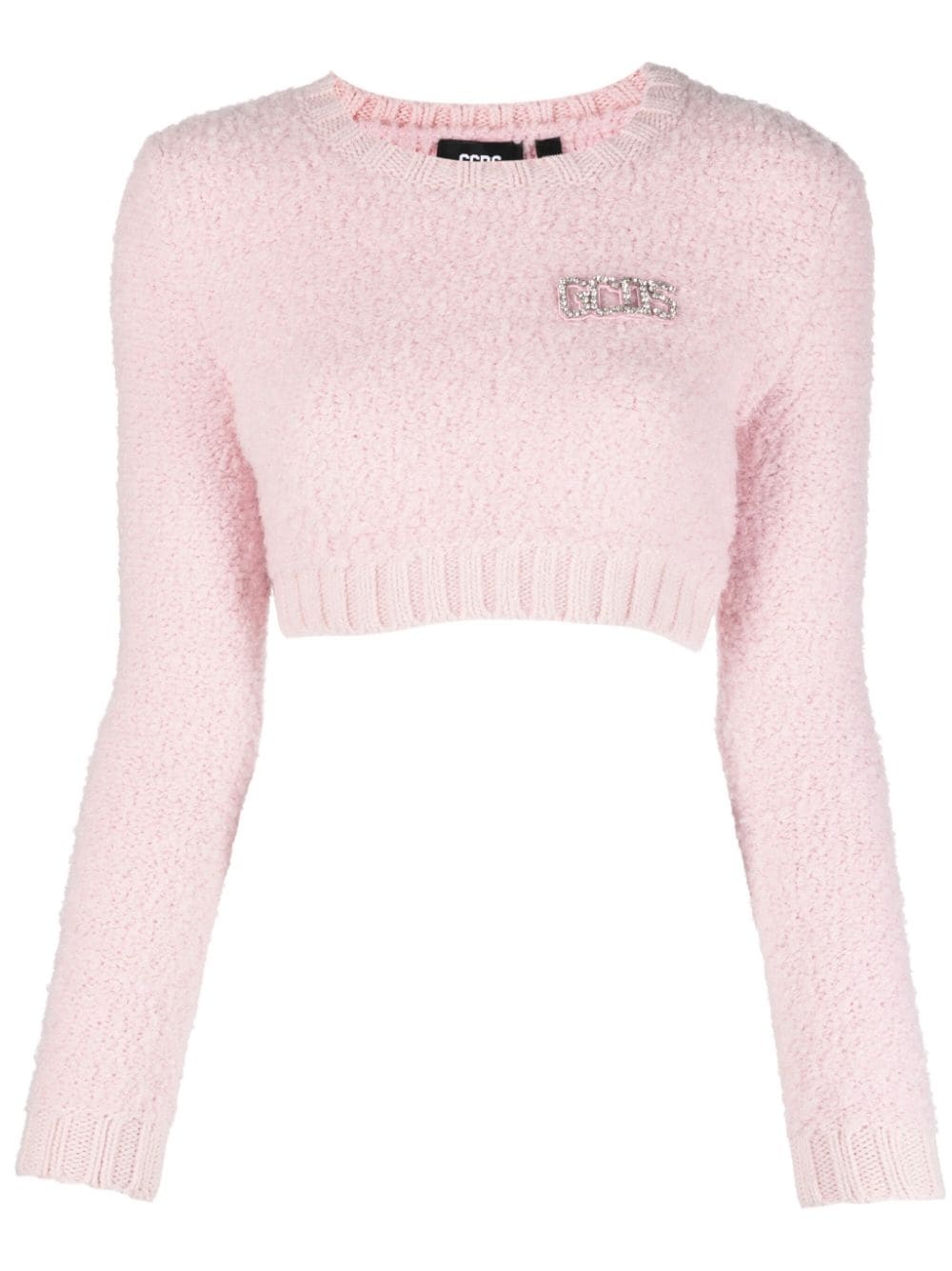crystal-embellished crew-neck crop top Highlights - Light pink - Knitted construction - Crystal embellishment - Logo embellishment - Crew neck - Long sleeves - Ribbed cuffs and hem - Straight hem - Cropped Made in Italy Composition Acrylic 45%, Virgin Wool 25%, Alpaca Wool 25%, Polyamide 5% SIZE & FIT Model measurements Height 5 ft 9 in(1.75 m) Bust/Chest 33.07 in(84 cm) Hips 35.03 in(89 cm) Waist 24.01 in(61 cm) FittingInformation Designed for a slim fit that sits just away from the body offering a close yet comfortable fit Cropped in length Made with a midweight knit, this piece offers some stretch This piece fits true to size – take your usual size