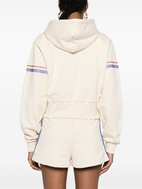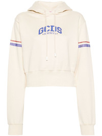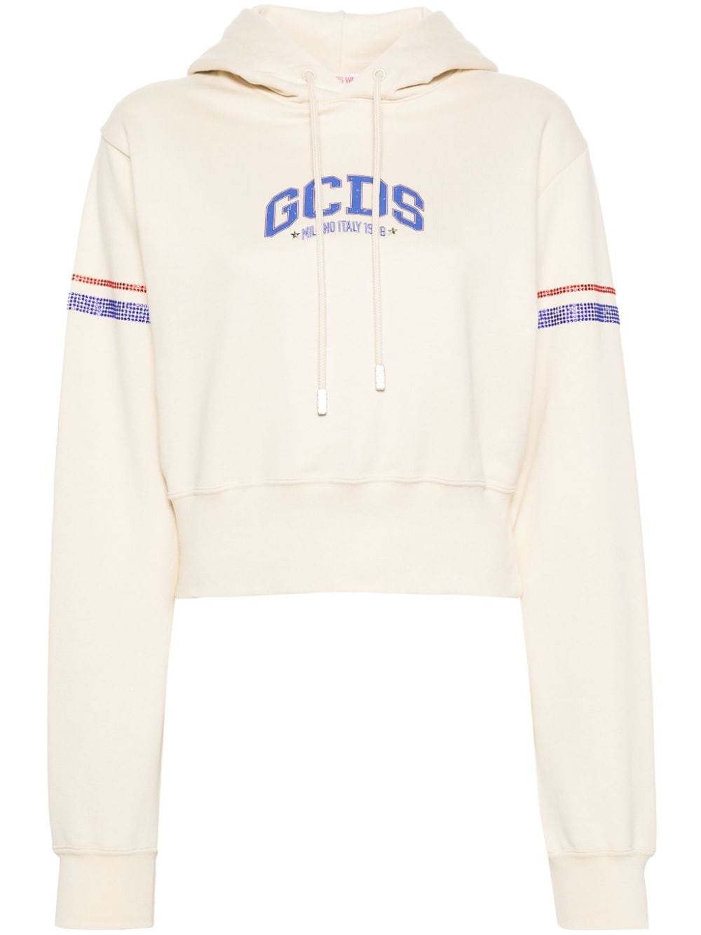 crystal-embellished cropped hoodie Highlights - Off-white/blue/red - Cotton - Jersey texture - Crystal embellishment to the sleeves - Logo print to the front - Silver-tone logo plaque to the drawstring - Drawstring hood - Drop shoulder - Long sleeves - Ribbed cuffs and hem - Cropped - Straight hem - French terry lining Made in Italy Composition Cotton 100% SIZE & FIT Model measurements Height 5 ft 11 in(1.8 m) Bust/Chest 31.49 in(80 cm) Hips 36.61 in(93 cm) Waist 24.4 in(62 cm) FittingInformation Designed for a relaxed fit, this piece allows for comfort and movement when worn Made from a midweight non-stretch fabric, this piece offers minimal elasticity when worn This piece fits true to size – take your usual size Washing instructions Hand Wash