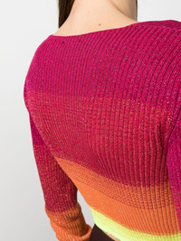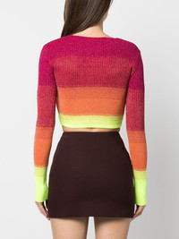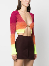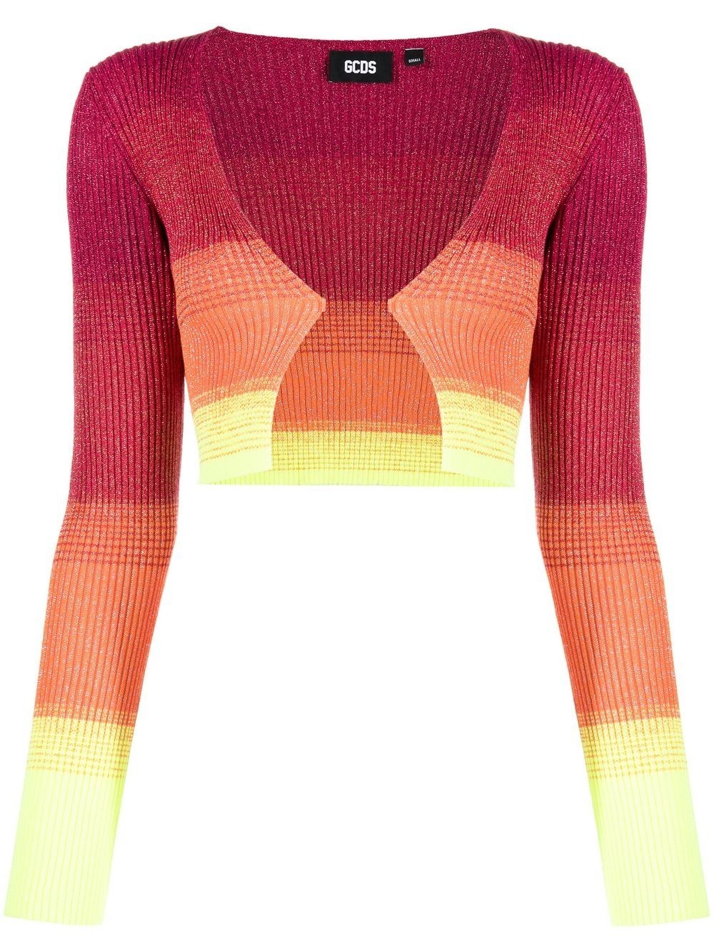 degrade-effect lurex cropped cardigan Highlights - Degrade-effect lurex cropped cardigan from gcds featuring fuchsia pink, lurex detailing, knitted construction, horizontal stripe pattern, plunging v-neck, long sleeves, cropped, degrade effect and front clip fastening with gold-tone logo plaque. Made in Italy Composition Viscose 60%, Polyester 27%, Metal 13% SIZE & FIT Model measurements Height 5 ft 10 in(1.77 m) Bust/Chest 35.03 in(89 cm) Hips 35.03 in(89 cm) Waist 23.62 in(60 cm) Measurement BUST 22.04 in(56 cm) LENGTH 13.77 in(35 cm) SLEEVE LENGTH 25.19 in(64 cm) Shoulder Width 11.41 in(29 cm) FittingInformation This piece fits true to size. We recommend you get your regular size Cut for a slim fit Made with a mid-weight fabric Washing instructions Hand Wash