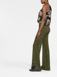 logo-print high waist trousers green sheer coverage all-over logo print drawstring fastening waist side slits straight hem Made in Italy Composition Viscose 70%, Metallic Fibre 15%, Polyester 15% SIZE & FIT Model measurements Height 5 ft 11 in(1.8 m) Bust/Chest 31.49 in(80 cm) Hips 36.61 in(93 cm) Waist 24.4 in(62 cm) FittingInformation This piece fits true to size. We recommend you get your regular size Designed to be fitted at the waist and hips, loose over the leg Made with a mid-weight fabric Washing instructions Hand Wash