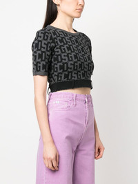Matilda monogram cropped top black/grey knitted construction intarsia knit monogram pattern round neck short sleeves ribbed cuffs ribbed hem cropped Made in Italy Composition Polyamide 100% SIZE & FIT Model measurements Height 5 ft 10 in(1.78 m) Bust/Chest 31.49 in(80 cm) Hips 36.22 in(92 cm) Waist 25.59 in(65 cm) FittingInformation This piece fits true to size. We recommend you get your regular size Cut for a close fit Made with a mid-weight fabric Washing instructions Hand Wash