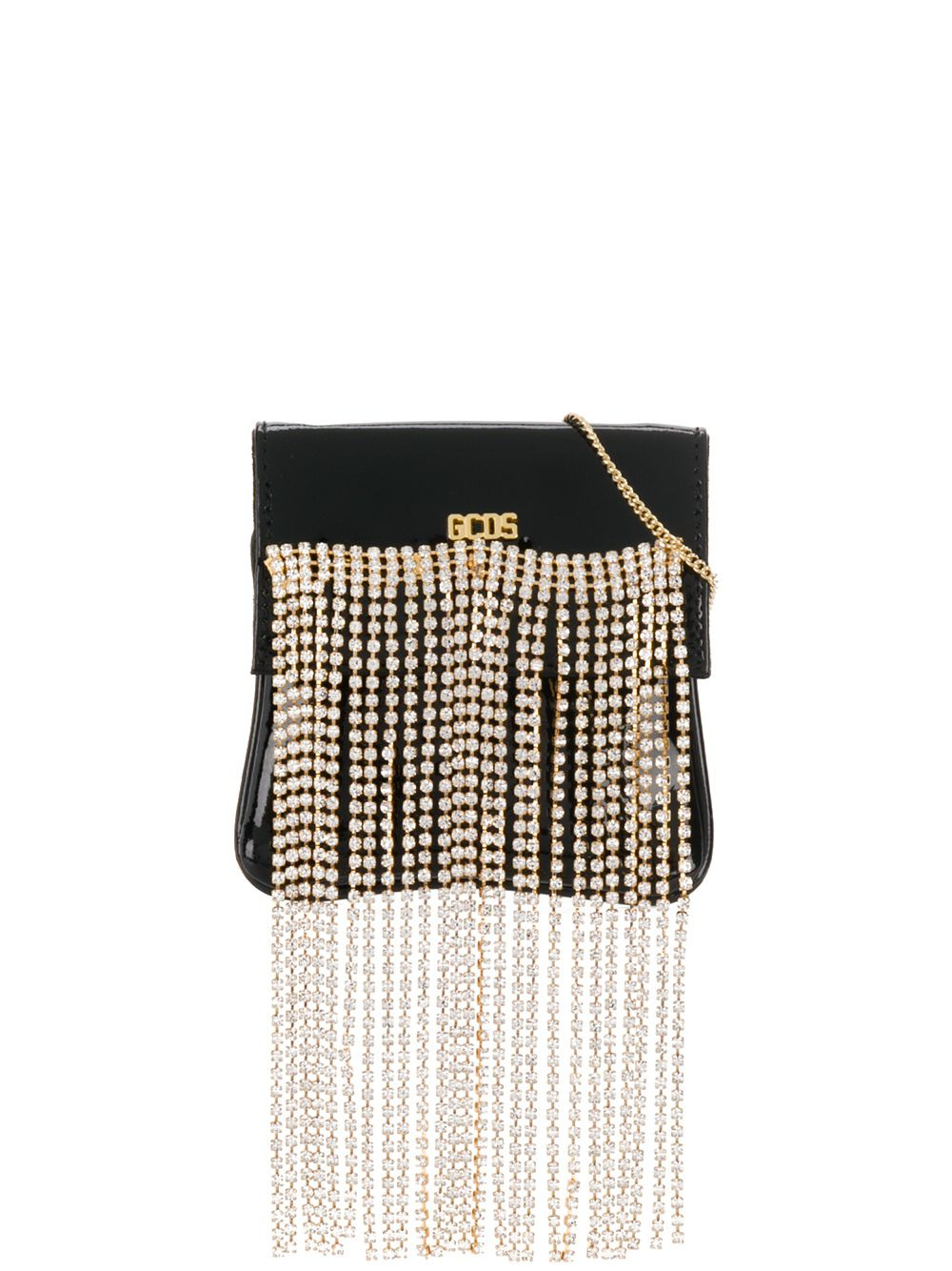 mini rhinestone crossbody bag Black leather-cotton blend mini rhinestone crossbody bag from GCDS featuring a chain shoulder strap, a gold-tone logo plaque, a foldover top with snap closure, a main internal compartment and rhinestone embellishments. Made in Italy Composition Lining: Cotton 100% Outer: Calf Leather 100% SIZE & FIT Model measurements Height 5 ft 10 in(1.79 m) Bust/Chest 32.67 in(83 cm) Hips 35.43 in(90 cm) Waist 23.62 in(60 cm) Measurement HEIGHT 3.54 in(9 cm) STRAP 18.11 in(46 cm) WIDTH 3.54 in(9 cm)