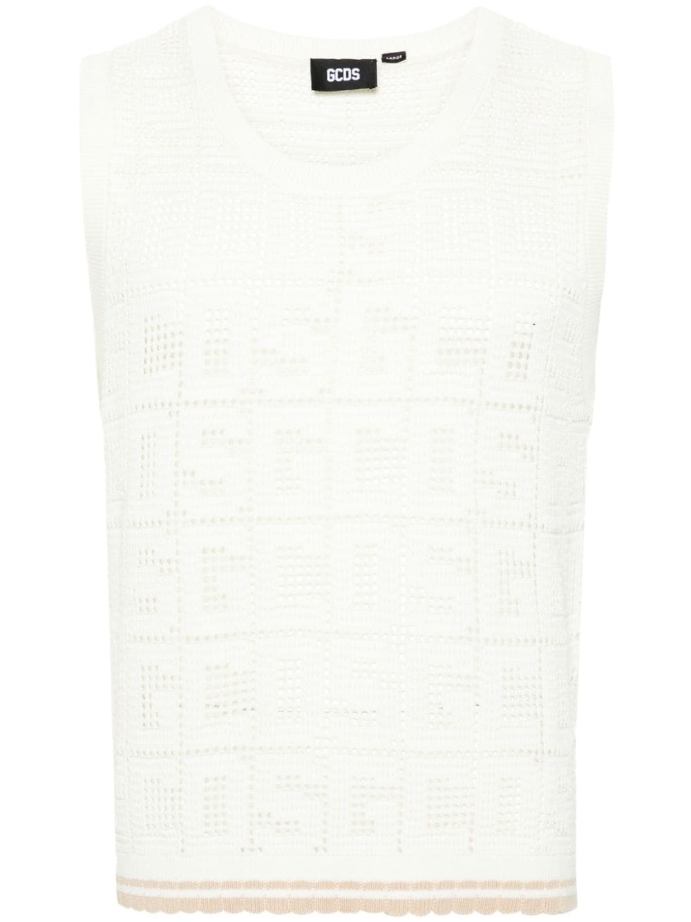 monogram macrame sleeveless jumper Highlights - Off-white - Cotton blend - Macrame - Monogram pattern - Contrasting trim - Crew neck - Sleeveless - Scallop hem Imported Composition Acrylic 50%, Cotton 50% SIZE & FIT Model measurements Height 6 ft 2 in(1.89 m) Bust/Chest 37.79 in(96 cm) Hips 37 in(94 cm) Waist 29.92 in(76 cm) FittingInformation Designed for a relaxed fit, this piece allows for comfort and movement when worn Made with a midweight knit, this piece offers some stretch This piece fits true to size – take your usual size Washing instructions Machine Wash