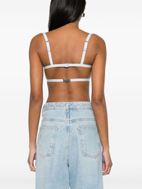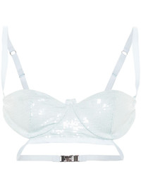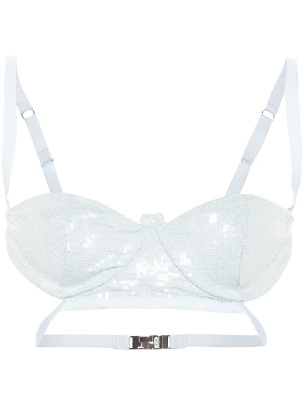 sequined bra top Highlights - Light blue - Stretch-design - Sequin design - Adjustable spaghetti straps - Sweetheart neck - Double-strap design - Mesh lining - Silver-tone hardware - Rear logo-buckle fastening - Rear clasp fastening Made in Italy Composition Outer: Viscose 70%, Polyurethane 30% Lining: Polyester 80%, Elastane 20% SIZE & FIT Model measurements Height 5 ft 11 in(1.8 m) Bust/Chest 30.7 in(78 cm) Hips 35.03 in(89 cm) Waist 24.4 in(62 cm) FittingInformation Designed for a close fit throughout The adjustable shoulder straps allow for a preferred fit when worn Made from a lightweight fabric This piece fits true to size – take your usual size