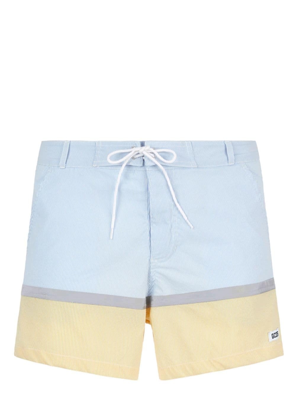 striped drawstring swim shorts Highlights - Light blue/light yellow - Stretch-design - Multi-way stripe pattern - Applique logo - Mid-rise - Elasticated drawstring waistband - Belt loops - Two side slit pockets - Two chest patch pockets - Above-knee length - Be mindful to try on swimwear over your own garments. Made in Italy Composition Outer: Polyamide 69%, Polyester 25%, Lycra 6% Lining: Polyester 100%