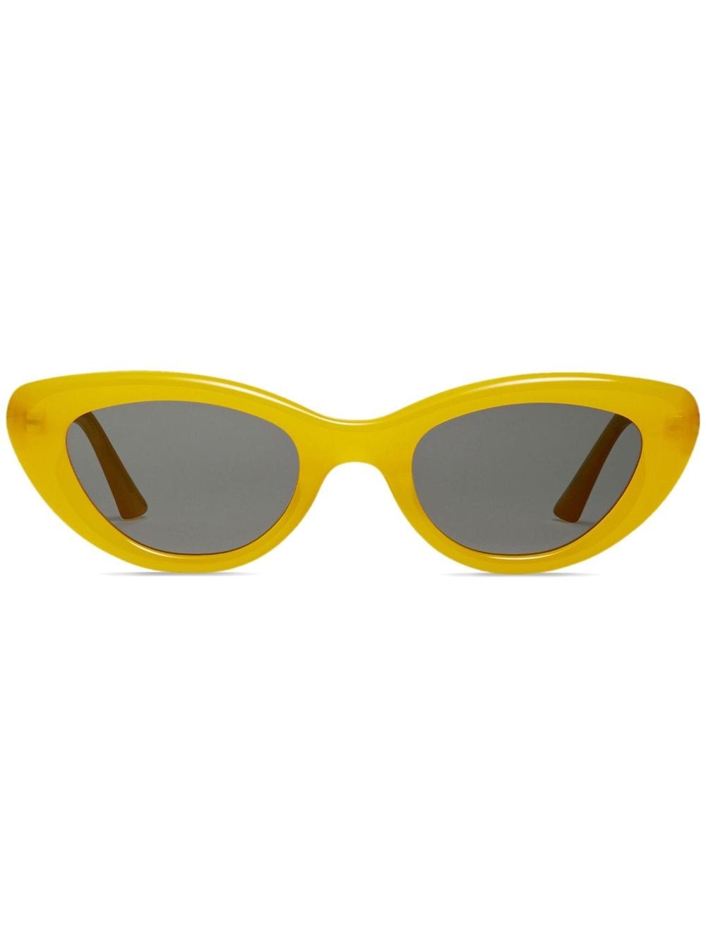 Conic tinted sunglasses canary yellow grey tinted lenses cat-eye frame embossed logo to the side straight arms curved tips UV-protective lenses These glasses come with a protective case. Imported Composition Acetate 100% SIZE & FIT Measurement Arm Length 5.7 in(14.5 cm) Bridge Width 0.9 in(2.3 cm) Lens Diameter 2 in(5.1 cm) Total Width 5.94 in(15.1 cm)