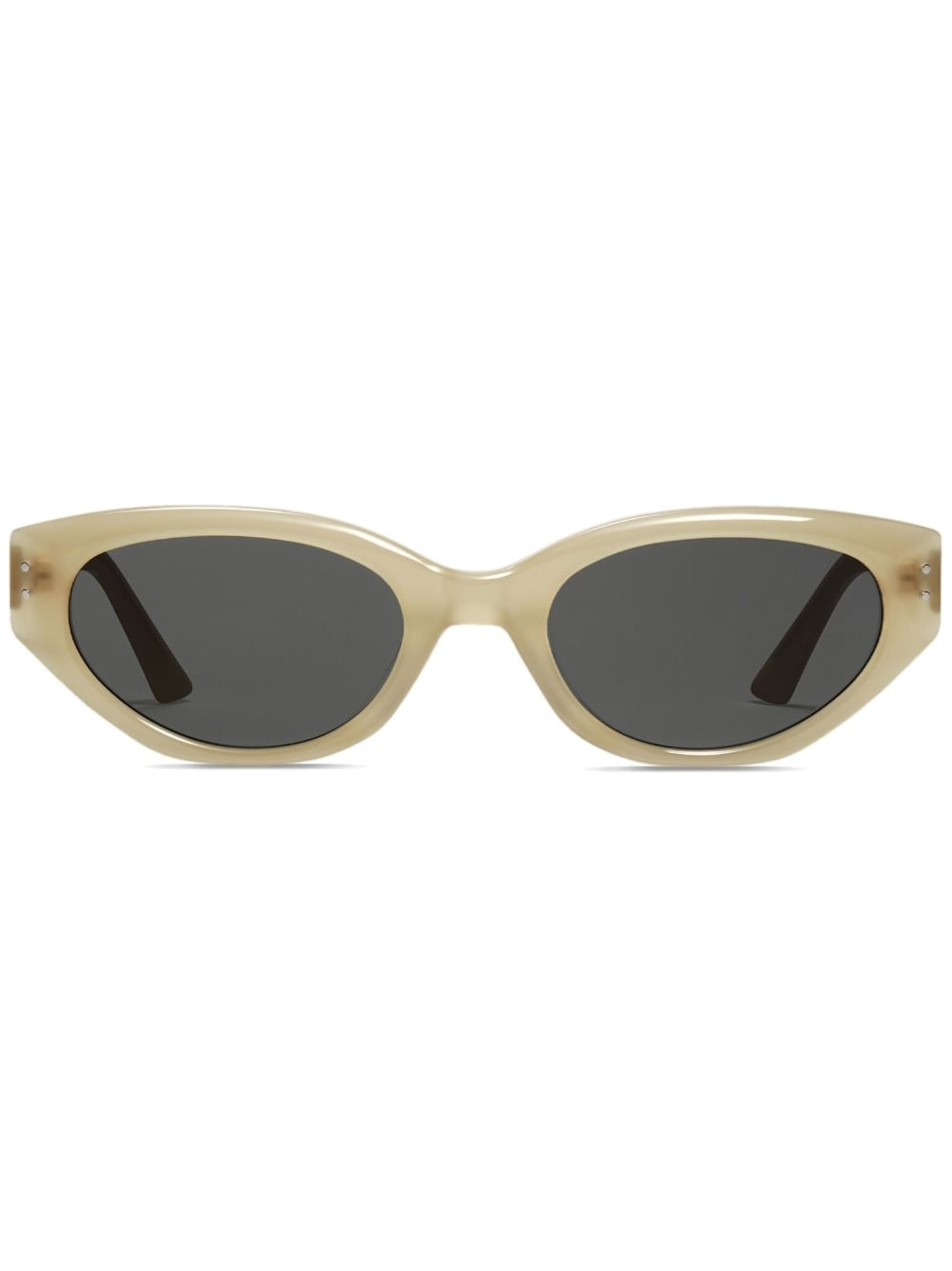 Rococo tinted sunglasses banana yellow grey tinted lenses cat-eye frame embossed logo to the side straight arms curved tips UV-protective lenses These glasses come with a protective case. Imported Composition Acetate 100% SIZE & FIT Measurement Arm Length 5.78 in(14.7 cm) Bridge Width 0.82 in(2.1 cm) Lens Diameter 2.12 in(5.4 cm) Total Width 5.78 in(14.7 cm)