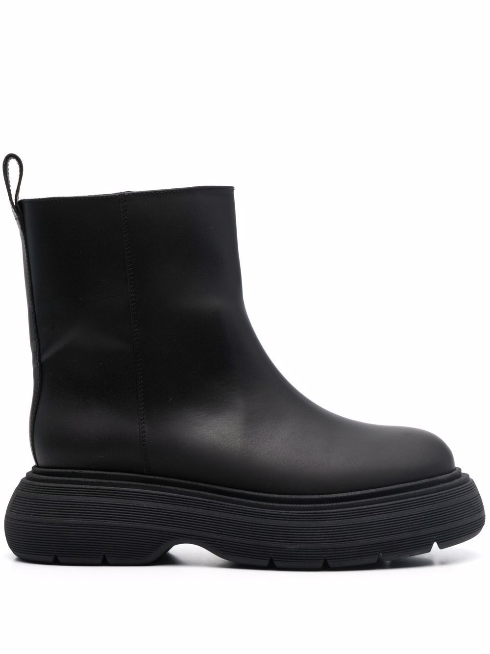 Martee ankle boots black leather round toe pull-tab at the heel flat rubber sole Made in Italy Composition Leather 100% SIZE & FIT FittingInformation This piece fits large – take one size down Measurement HEEL 2.75 in(7 cm) HEIGHT 5.7 in(14.5 cm) PLATFORM 1.96 in(5 cm)