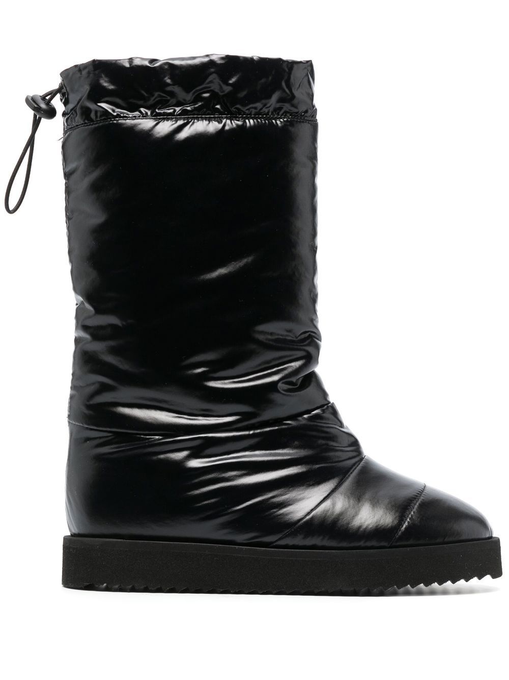 patent padded knee-high boots black patent finish padded design round toe flat rubber sole calf-length drawstring fastening Made in Italy Composition Sole: Rubber 100% Outer: Fabric 100% Lining: Fabric 100% SIZE & FIT Measurement HEEL 0.98 in(2.5 cm) CIRCUMFERENCE 12.59 in(32 cm) Sole height 0.98 in(2.5 cm) HEIGHT 10.62 in(27 cm)