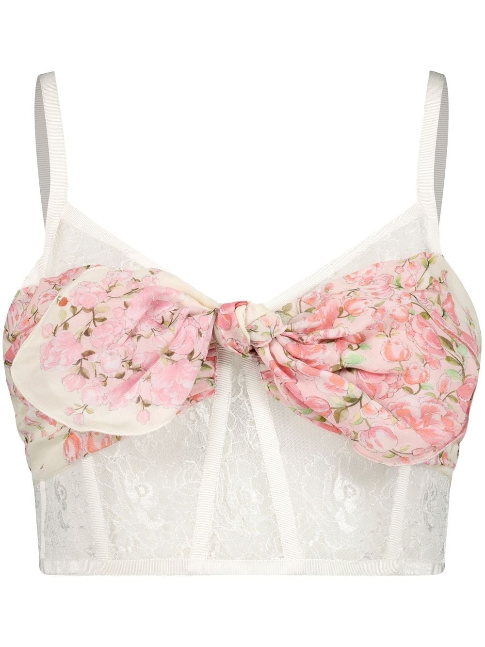 bow-embellished bralette top Nodding to lingeries styles, this Giambattista Valli bralette top is designed with a corset-like base decorated with floral lace panelling. The look is complete with an enveloping floral-printed sash, tied at the front in an oversized bow. Made in Italy Composition Top: Silk 100% Washing instructions Dry Clean Only