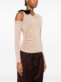 bow-embellished cut-out top Giambattista Valli's silk-cashmere top is a testament to the brand's affinity for romantic detailing. A black velvet bow details one shoulder, adding an unexpected twist to the sotly ruched silhouette. Highlights - Camel brown - Cashmere-silk blend - Bow detailing - Ruched detailing - V-neck - Cut-out detailing - Long sleeves Made in Italy Composition Cashmere 70%, Silk 30% SIZE & FIT Model measurements Height 5 ft 11 in(1.8 m) Bust/Chest 31.88 in(81 cm) Hips 35.03 in(89 cm) Waist 24.01 in(61 cm) FittingInformation Designed for a slim fit that sits just away from the body offering a close yet comfortable fit Made with a lightweight knit, this piece offers some stretch This piece fits true to size – take your usual size Washing instructions Dry Clean Only