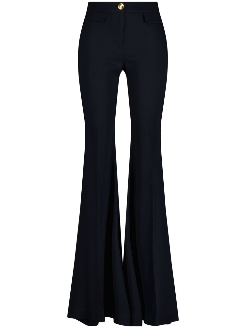 crepe-texture flared trousers Highlights - Black - Crepe texture - High-waisted - Concealed fly and button fastening - Front flap pocket - Slim cut - Flared Made in Italy Composition Viscose 97%, Elastane 3% SIZE & FIT FittingInformation Designed with a flared hem, these trousers allow for a close fit at the waist with a slim fit over the leg and widening towards the hem Particularly long in length; consider your own measurements Made from a midweight stretch fabric, this piece offers elasticity and flexibility when worn Washing instructions Dry Clean Only