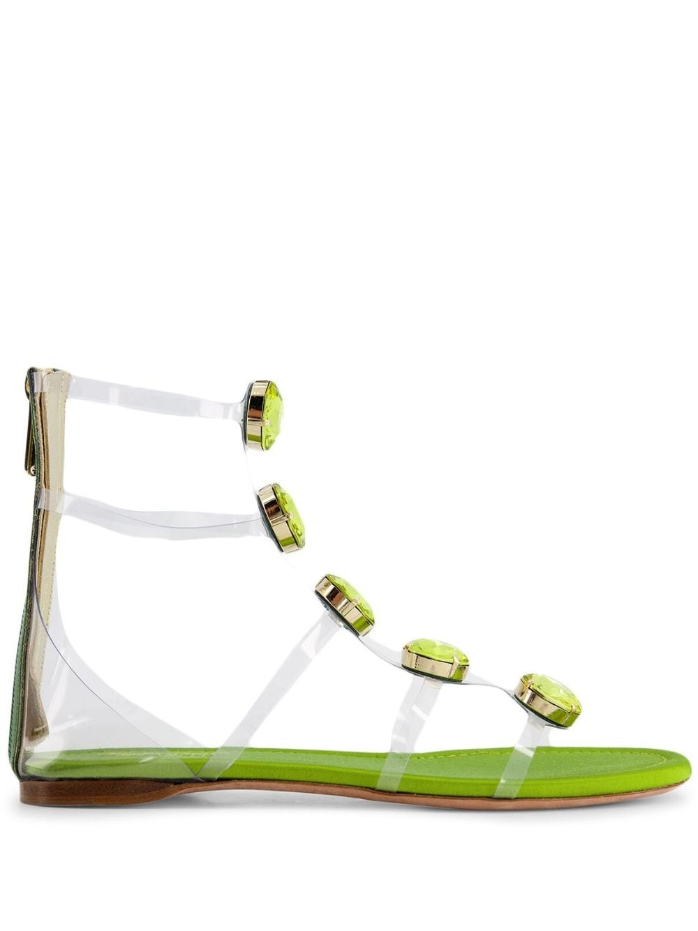 Diamond Clash flat sandals Giambattista Valli's sense of refinement is evidenced by the crystal-embellished gemstones that decorate these sandals. They're imagined in a green hue and are secured with gold-tone rear zip fastenings. Highlights - Apple green - Crystal embellishment - Open toe - Branded leather insole - Rear zip fastening - Gold-tone hardware - Flat rubber sole Made in Italy Composition Sole: Leather 100% Lining: Fabric 100% Outer: PVC 95%, Leather 5%