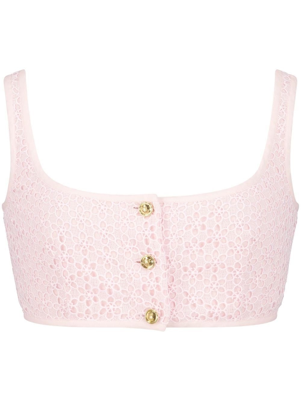 lace-embroidered sleeveless crop top For SS23, Giambattista Valli continues to showcase its romantic aesthetic, as shown on this light pink top. Embellished with flowery lace, it's complete with embossed gold-tone buttons on the front. Made in Italy Composition Top: Polyester 100% Washing instructions Dry Clean Only