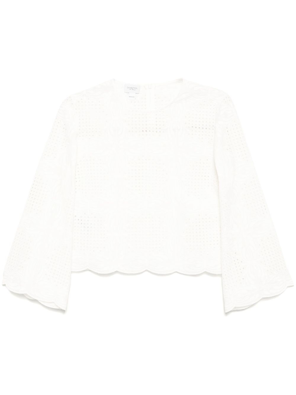 round-neck top Highlights - White - Rear zip fastening - Cut-out detailing - Semi-sheer construction Made in Italy Composition Polyester 64%, Cotton 36% SIZE & FIT Model measurements Height 5 ft 10 in(1.78 m) Bust/Chest 32.67 in(83 cm) Hips 37 in(94 cm) Waist 25.59 in(65 cm) FittingInformation Designed to be unstructured, offering a loose fit throughout Made from a midweight non-stretch fabric, this piece offers minimal elasticity when worn Washing instructions Machine Wash