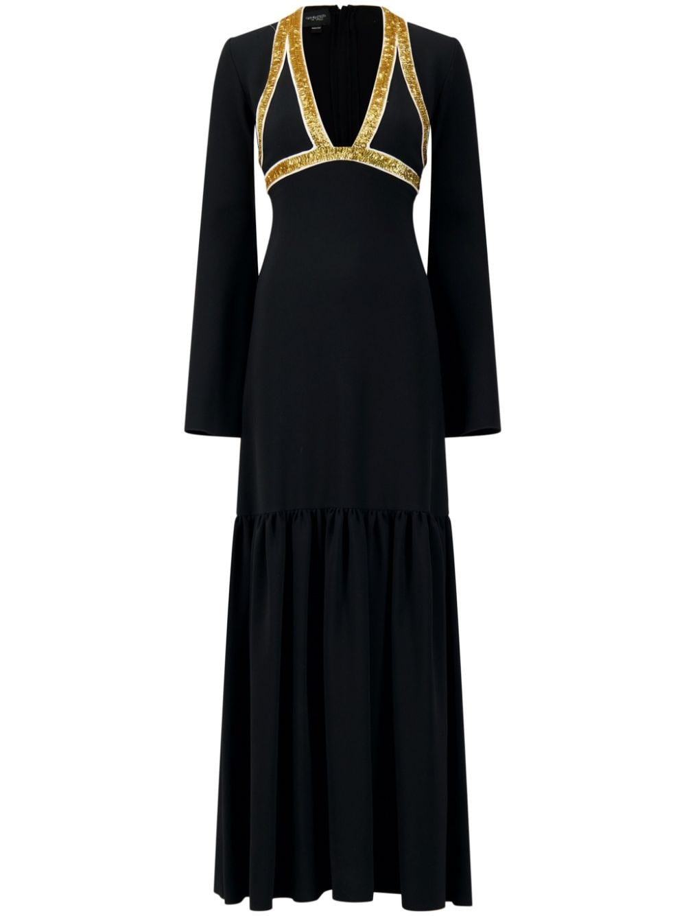 sequin-embellished crepe gown Crafted from fluid crepe, this black Giambattista Valli gown boasts a streamlined, floor-sweeping silhouette accented with scores of golden sequins, which frame the plunging V-neckline and bust. Highlights - Black - Crepe texture - Sequin embellishment - Plunging v-neck - Concealed rear zip fastening - Long sleeves - Tiered skirt - Floor-length - Flared hem Made in Italy Composition Viscose 50%, Acetate 47%, Elastane 3% Washing instructions Dry Clean Only