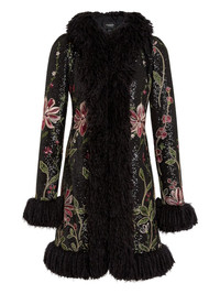 sequin-embellished floral-embroidered coat Highlights - Black - Sequin embellished - Floral embroidery - Frayed fur trim - Long sleeves Made in Italy Composition Artificial Fur 100%, Polyester 55%, Viscose 45% Washing instructions Read Manufacturer Guidelines