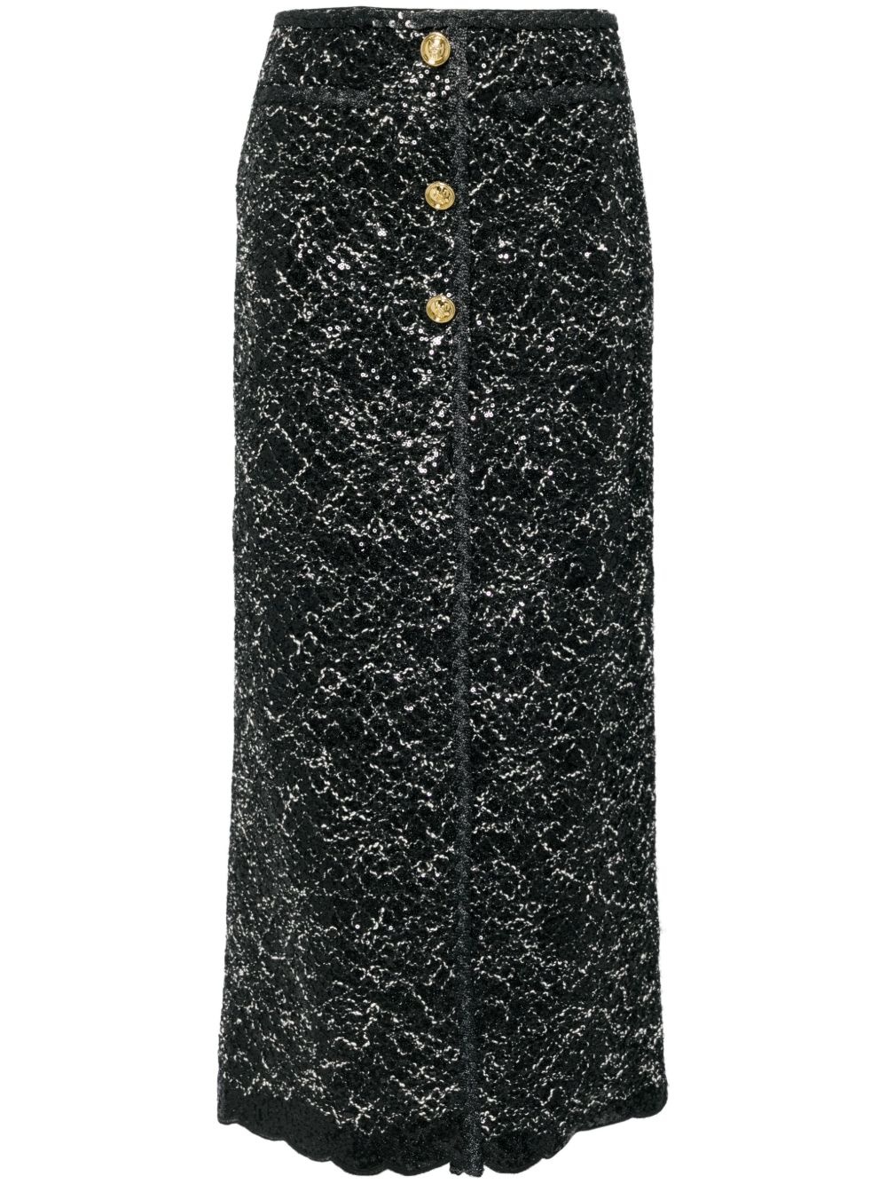 sequin-embellished skirt Highlights - Black/white - Threaded design - Sequin embellishment - Decorative button detailing - Gold-tone buttons - Scallop hem - Front slit - Concealed rear zip fastening - Silk lining Made in Italy Composition Lining: Silk 100% Outer: Polyester 70%, Cotton 15%, Acrylic 10%, Polyamide 5% SIZE & FIT Model measurements Height 5 ft 9 in(1.76 m) Bust/Chest 31.1 in(79 cm) Hips 35.03 in(89 cm) Waist 24.4 in(62 cm) FittingInformation This midi-length skirt is intended to be worn high on the waist Made from a midweight non-stretch fabric This piece fits true to size – take your usual size Washing instructions Dry Clean Only