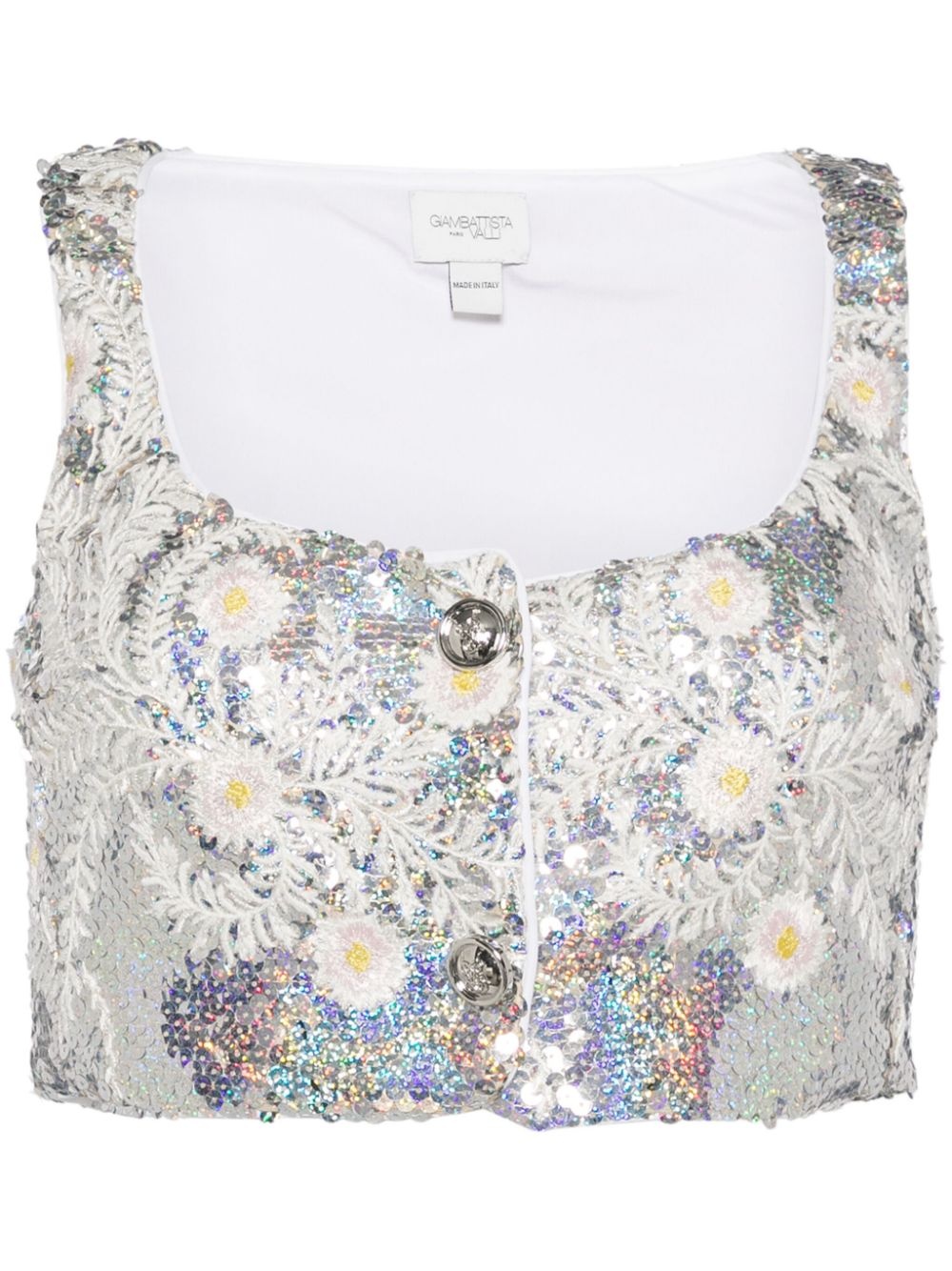 sequined crop top Highlights - Silver-tone/multicolour - Sequin embellishment - All-over floral embroidery - Round neck - Front press-stud fastening - Sleeveless - Cropped - Straight hem Made in Italy Composition Body: Polyester 100% Base: Viscose 97%, Elastane 3% Lining: Acetate 75%, Silk 25%