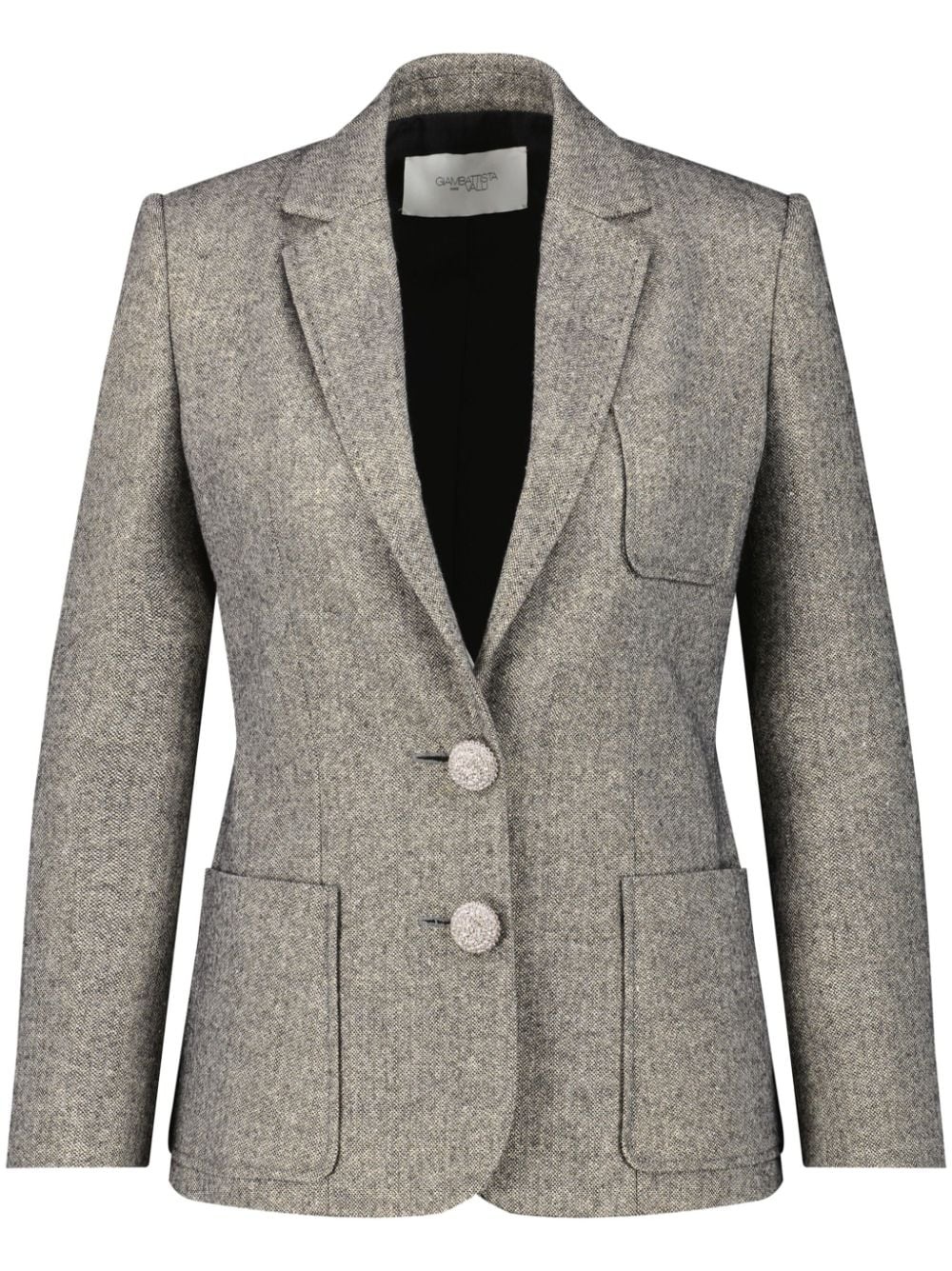 single-breasted blazer Cut to a clean-lined, single-breasted silhouette, this grey Giambattista Valli blazer is illuminated by two round crystal-encrusted buttons, a nod to the brand's love of sparkling embellishments. Highlights - Heather grey - Crystal-embellished buttons - Notched lapels - Front button fastening - Long sleeves - Three front patch pockets - Curved hem Made in Italy Composition Outer: Polyester 100% Washing instructions Dry Clean Only