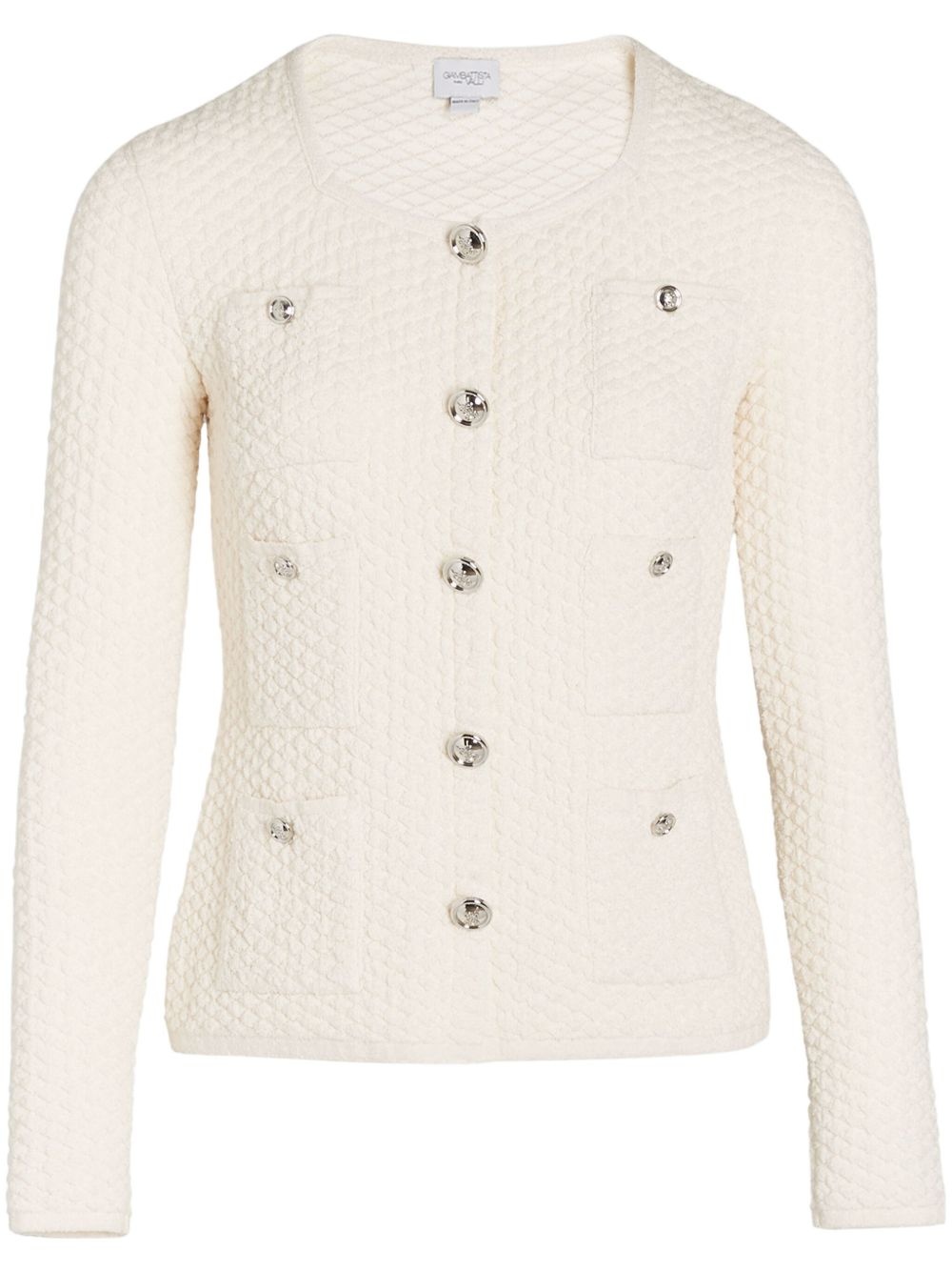 textured cardigan Highlights - White - Front button placket - Multiple patch pockets - Embossed silver-tone buttons - Scoop neck Made in Italy Composition Cotton 36%, Fabric 35%, Viscose 29%