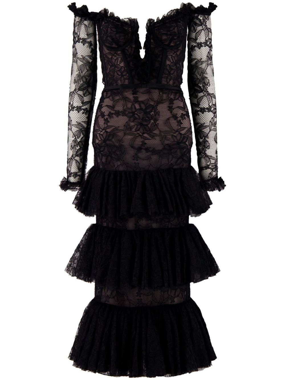 tiered off-the-shoulder lace dress Voluminous ruffles transform the column silhouette of this Giambattista Valli gown in dramatic fashion, framing the neckline and descending in structural tiers down the skirt. The fitted design is crafted in black floral lace with a notched off-the-shoulder neckline that bares the form to balance the demure long sleeves and floor-length hem. Highlights - Black - Cotton blend - Floral lace - Off-shoulder - V-neck - Ruffled trim - Concealed rear zip fastening - Long sleeves - Tiered skirt - Mid-length Made in Italy Composition Polyamide 80%, Cotton 20% Washing instructions Dry Clean Only