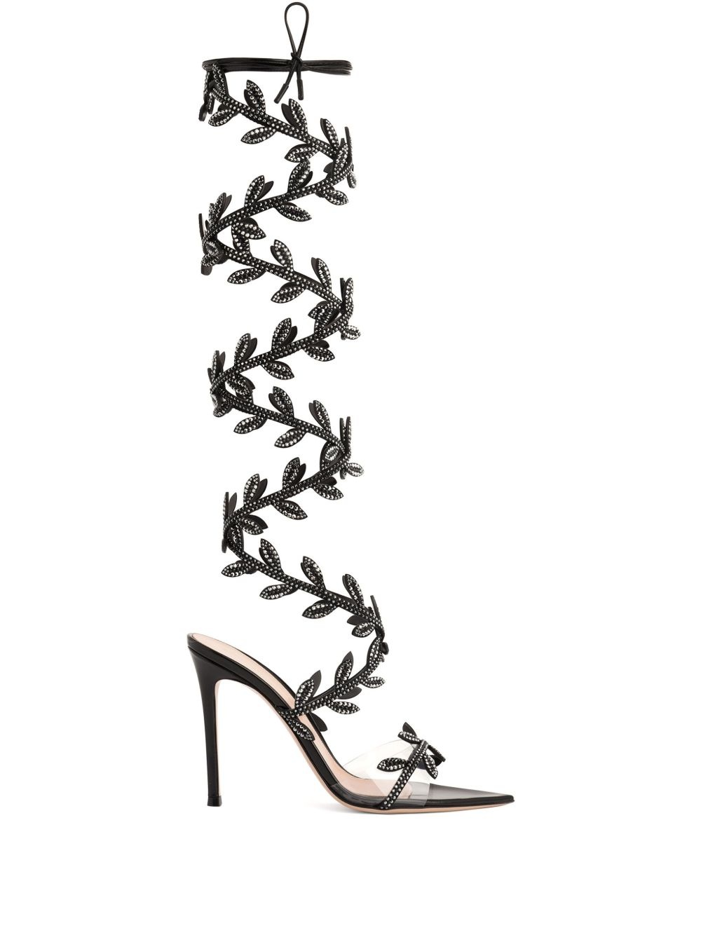 105m Crystal Flavia sandals Highlights - Black - Tie-fastening straps - Stiletto heel - Open toe - Leather sole Made in Italy Composition Outer: Thermoplastic Polyurethane (TPU) 100%, Nappa Leather 100%, Suede 100% Sole: Calf Leather 100% Lining: Calf Leather 100% SIZE & FIT Measurement HEEL 4.13 in(10.5 cm)