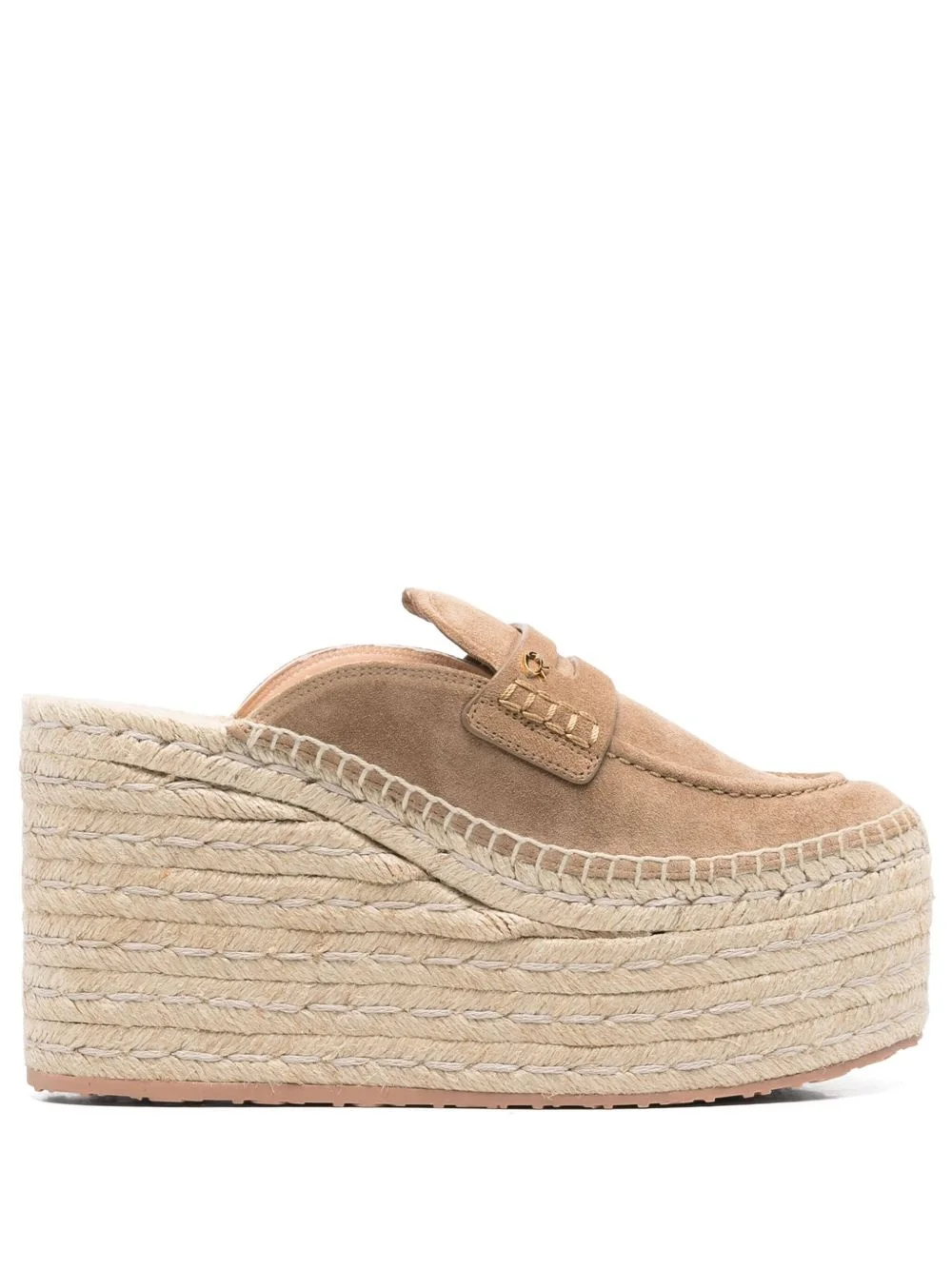 105mm Maxilla espadrilles Highlights - Sand beige - Branded leather insole - Braided raffia platform - Rubber outsole - Penny slot Imported Composition Sole: Rubber 100% Lining: Calf Leather 100% Outer: Calf Suede 100% SIZE & FIT Measurement HEEL 4.13 in(10.5 cm) PLATFORM 2.16 in(5.5 cm)