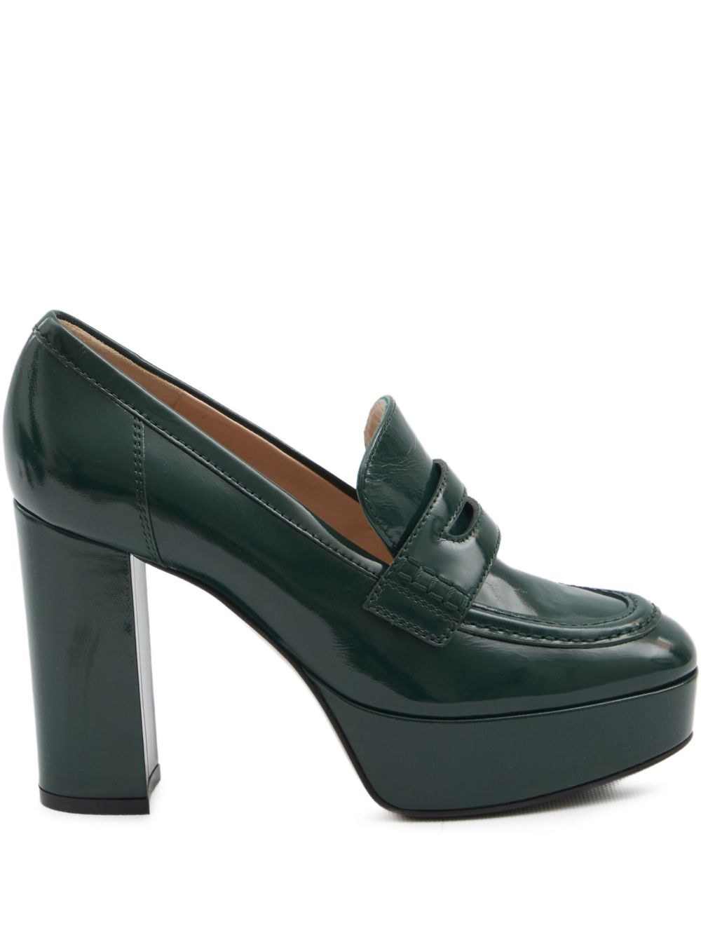 105mm penny-strap pumps Highlights - Green - Leather - Block heel - Penny-strap - Round toe Made in Italy Composition Lining: Leather 100% Outer: Nappa Leather 100% Sole: Rubber 100%, Leather 100% SIZE & FIT Measurement HEEL 4.13 in(10.5 cm) PLATFORM 1.18 in(3 cm)