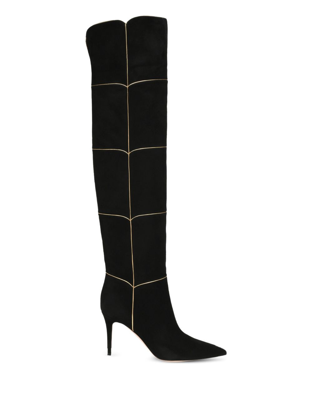 85mm Clarice suede boots Highlights - Black - Suede leather - Gold-tone trim - Pointed toe - Knee-high shaft - Stiletto heel Made in Italy Composition Lining: Nappa Leather 100% Sole: Leather 100% Outer: Suede 100% SIZE & FIT Measurement HEEL 3.34 in(8.5 cm)