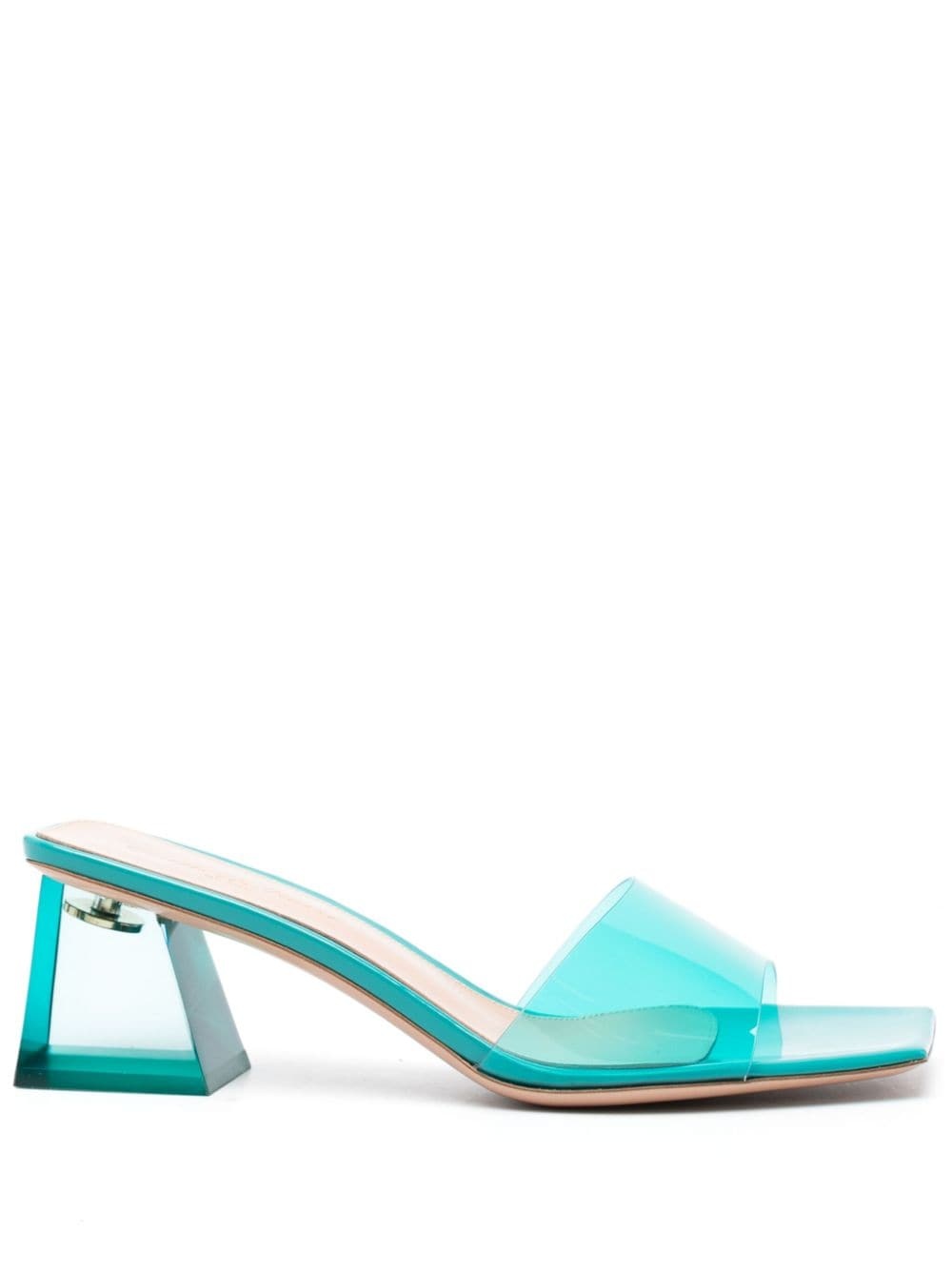 Cosmic 55mm mules Highlights - Aqua blue - Square open toe - Transparent strap - Branded leather footbed - 55mm low block heel - Leather outsole - Slip-on style - This piece comes complete with a protective dust bag. Made in Italy Composition PVC 100% SIZE & FIT Measurement HEEL 2.16 in(5.5 cm)