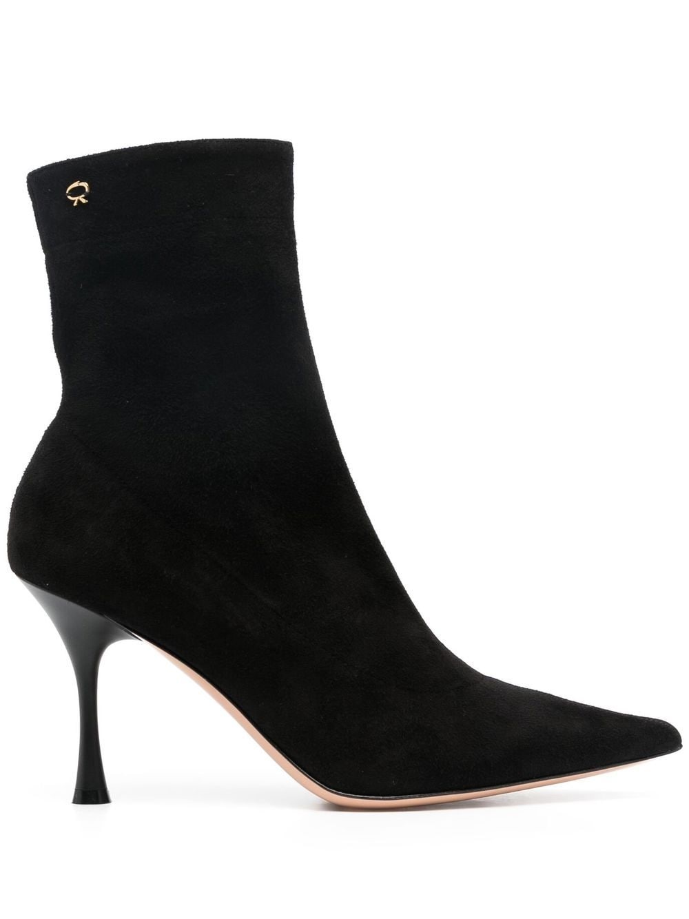 Dunn 85mm suede boots Highlights - Black - Calf suede - Gold-tone logo plaque - Pointed toe - Side zip fastening - Ankle-length - 85mm heel - Branded leather insole Made in Italy Composition Suede 100% SIZE & FIT Measurement HEEL 3.34 in(8.5 cm) HEIGHT 5.51 in(14 cm) CIRCUMFERENCE 9.84 in(25 cm) Sole height 0.39 in(1 cm)