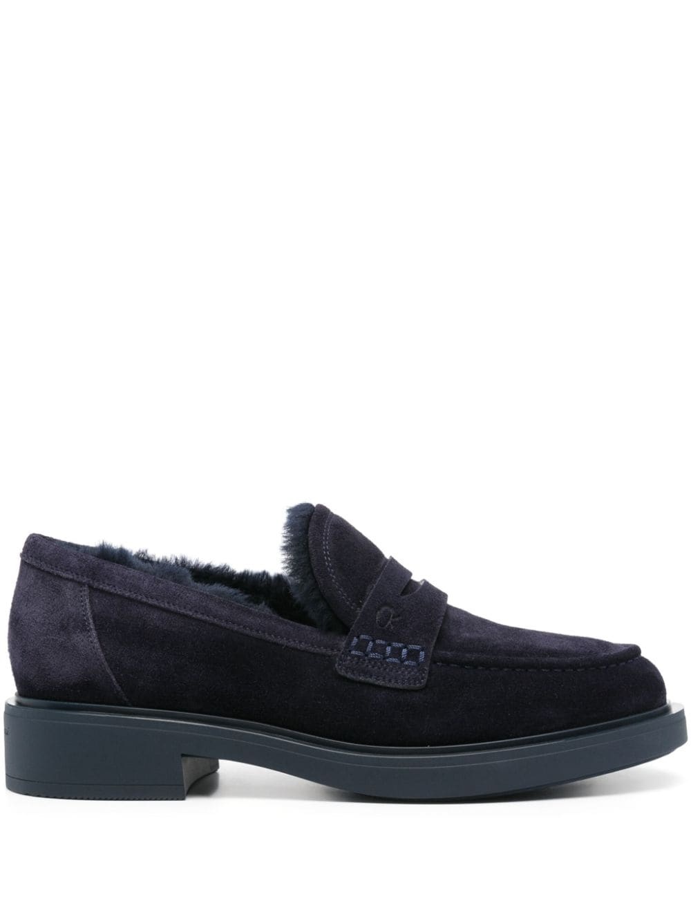 Harris loafers Highlights - Navy blue - Calf suede - Slip-on style - Front penny slot - Moc stitching - Round toe - Branded insole - Shearling lining - Low stacked heel - Rubber outsole Made in Italy Composition Leather 100% SIZE & FIT Measurement HEEL 1.37 in(3.5 cm) Sole height 0.78 in(2 cm)