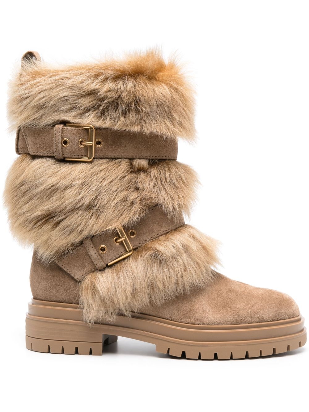Maverick boots Highlights - Caramel brown - Suede - Side buckle-straps fastening - Pull-on style - Pull-tab at the heel - Faux-fur detailing - Round toe - Branded insole - Rubber lug sole Imported Composition Outer: Suede 100%, Goat Fur 100% Sole: Rubber 100% Lining: Goat Fur 100% SIZE & FIT Measurement HEEL 8.26 in(21 cm) PLATFORM 1.96 in(5 cm) Sole height 1.18 in(3 cm)