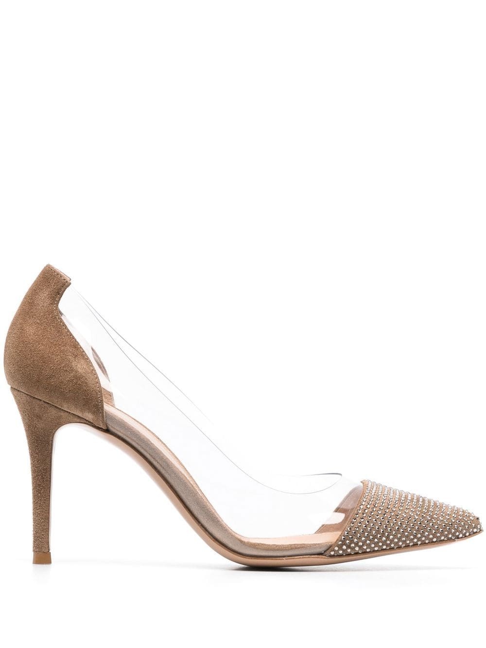 Plexi Glitz 85mm pumps Echoing the brand's feminine and alluring aesthetic, Gianvito Rossi presents these pumps. Constructed from suede, these camel brown pumps feature see-through side panels that reveal a subtle hint of skin and are finished with a pointed toe and a high stiletto heel. Highlights - Camel brown - Calf suede - Transparent panel detail - Rhinestone embellishment - Branded leather insole - Pointed toe - Slip-on style - High stiletto heel Made in Italy Composition Suede 100%